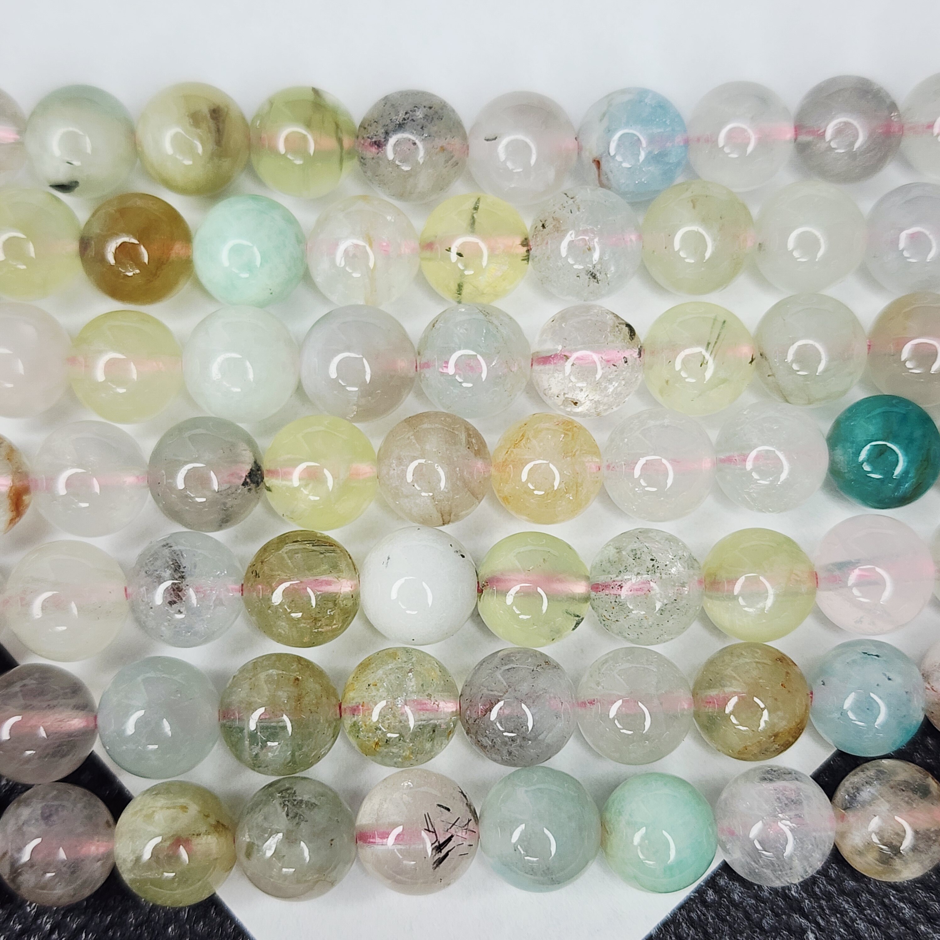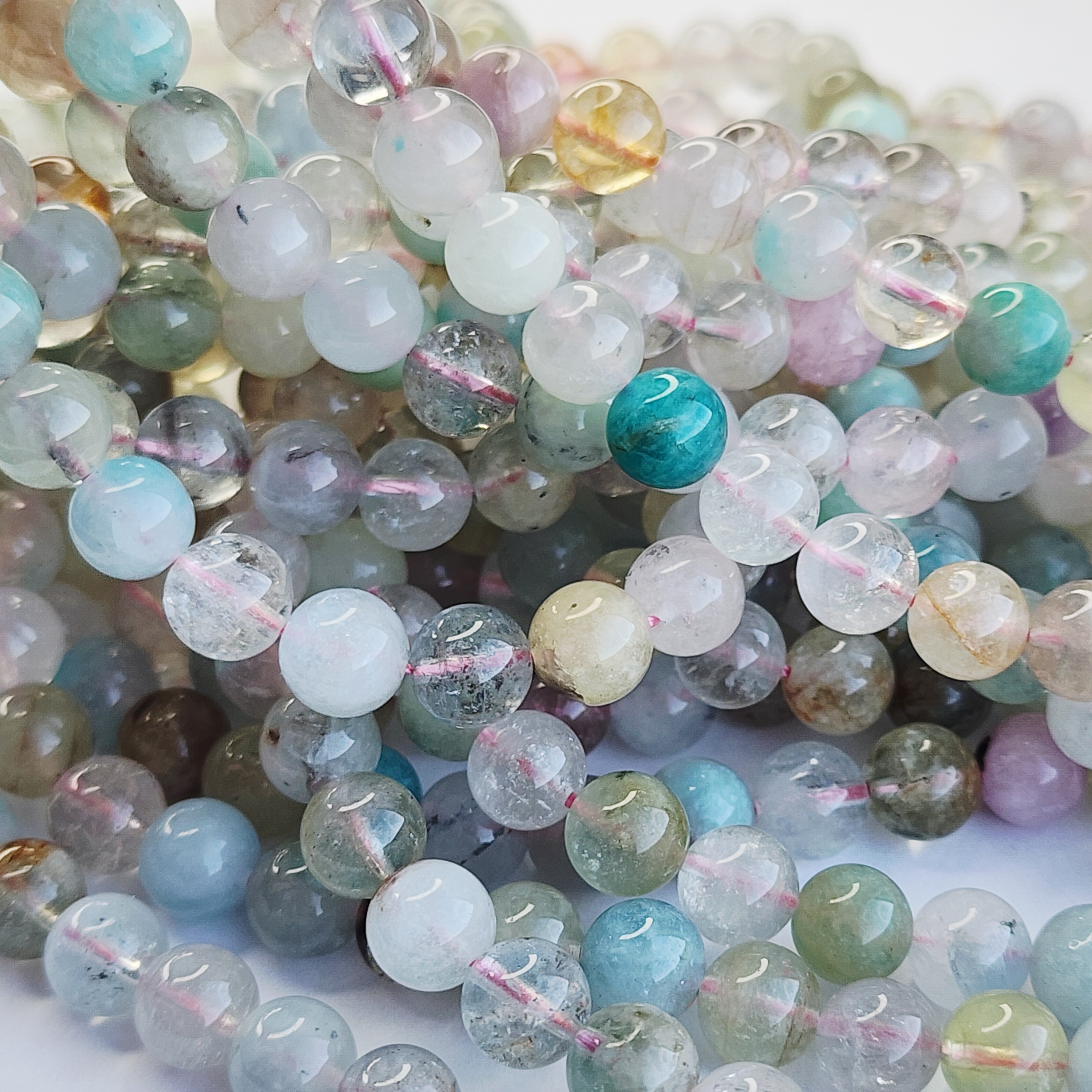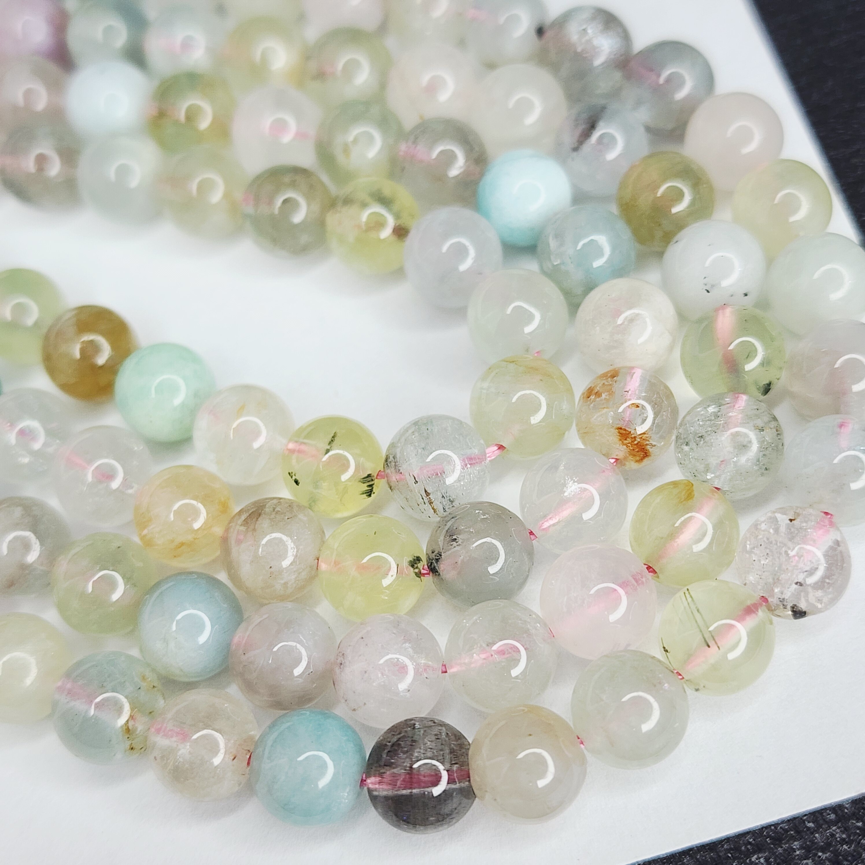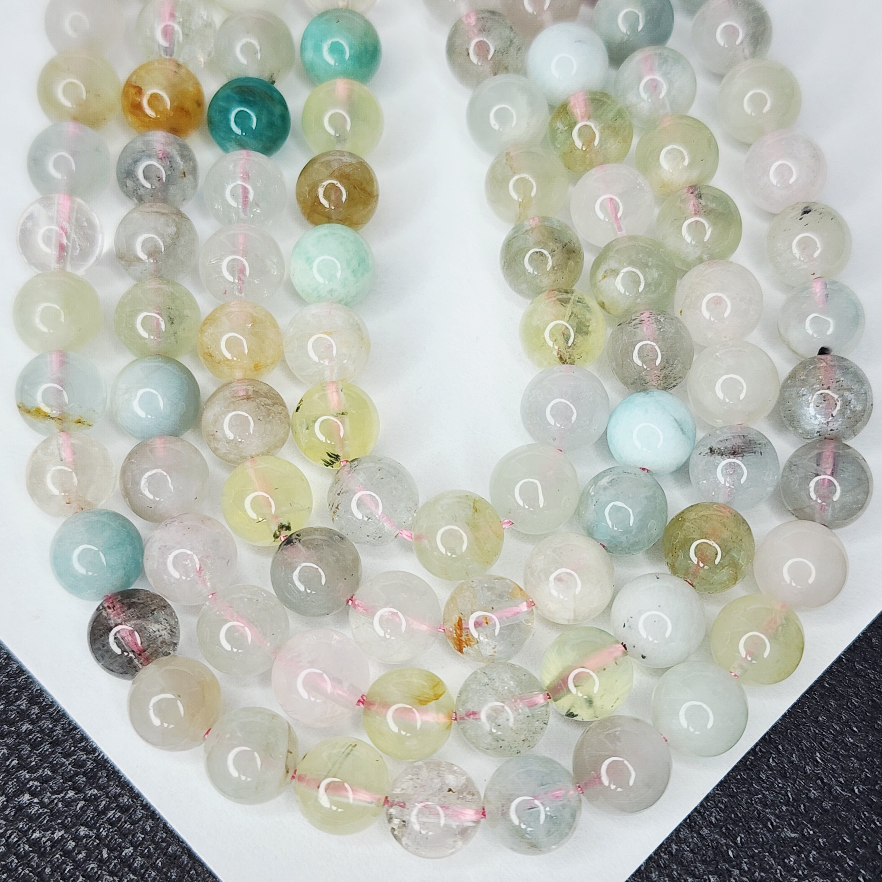 Микс бериллов и кварцев, НЕподкрашенный, с включениями, встречаются также бусинки пренита и амазонита, красивый природный микс, средний размер бусины 8.1 - 8.3мм