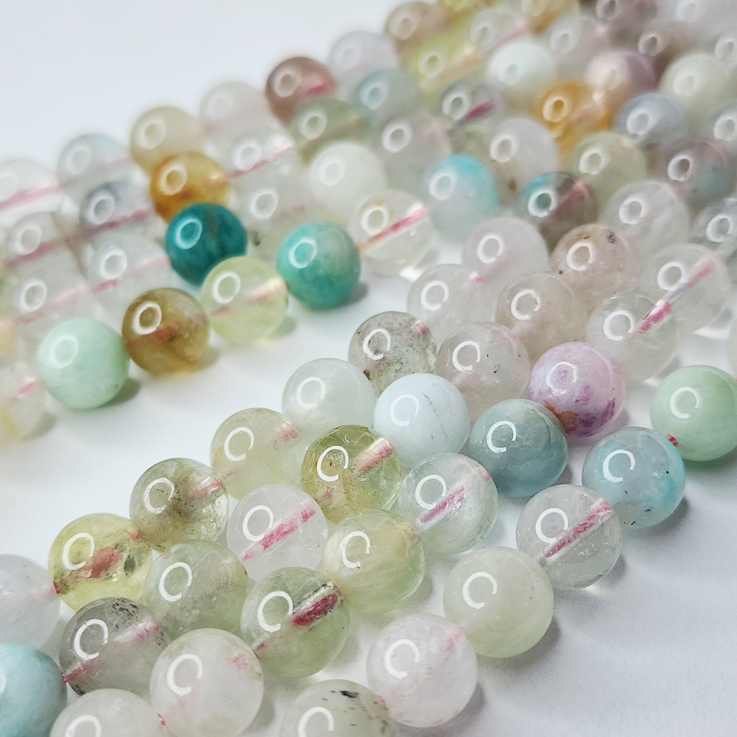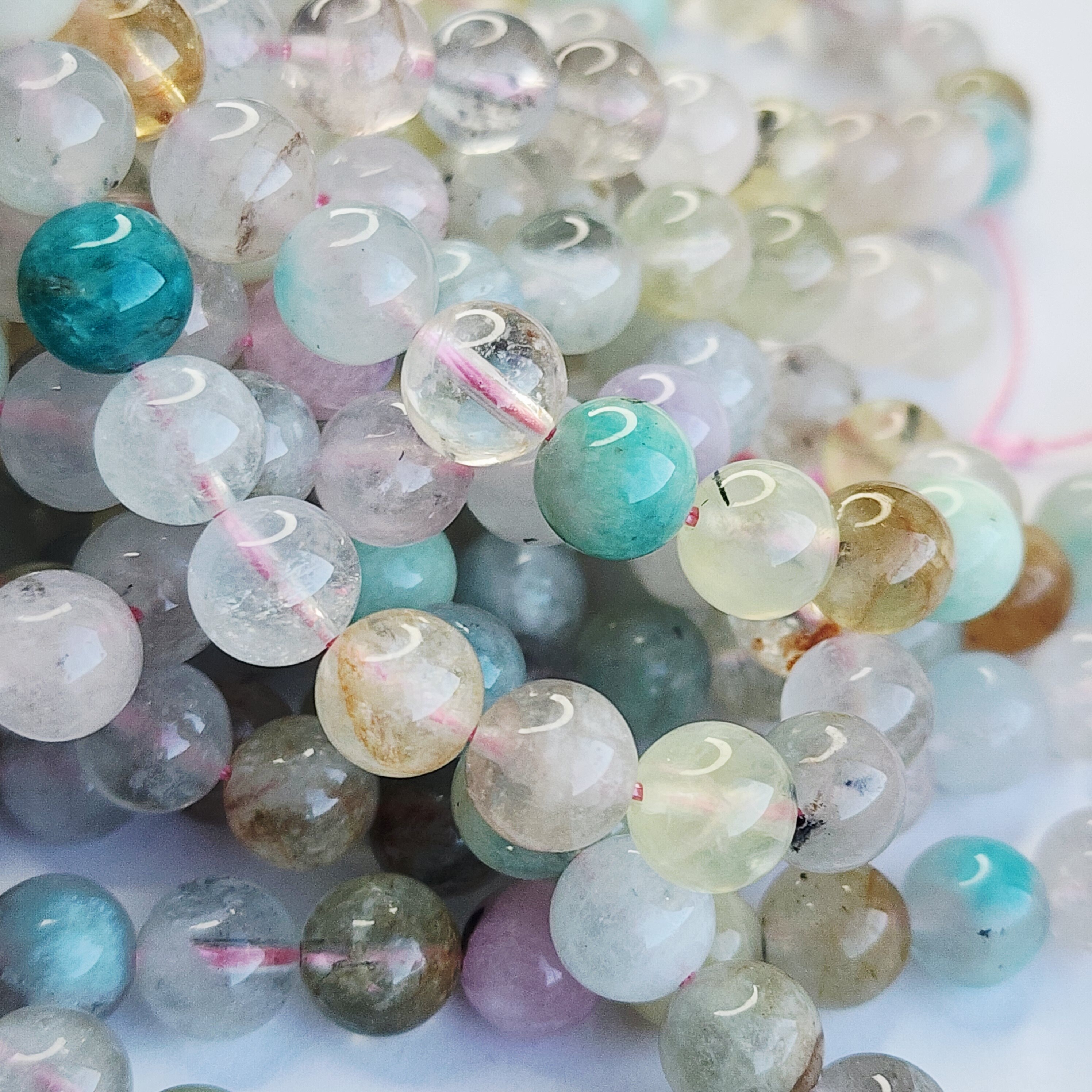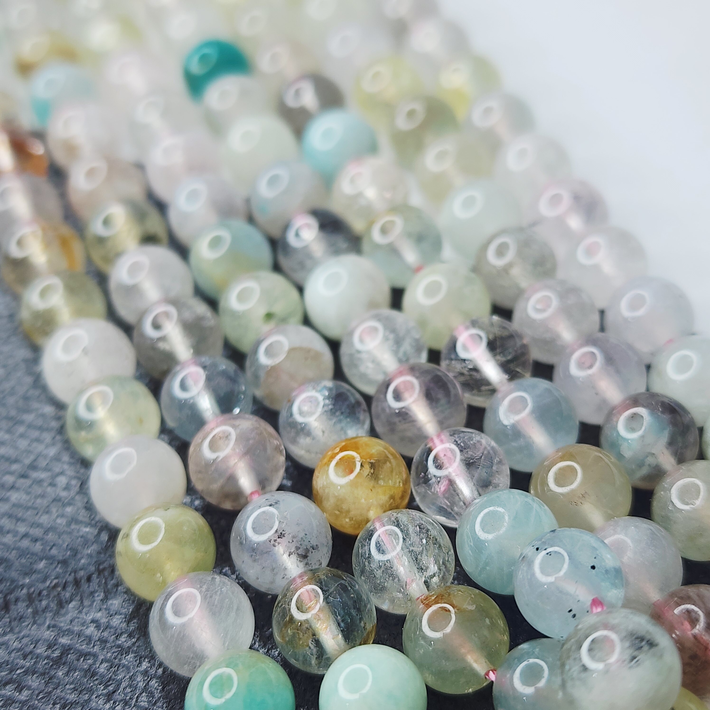 Микс бериллов и кварцев, НЕподкрашенный, с включениями, встречаются также бусинки пренита и амазонита, красивый природный микс, средний размер бусины 8.1 - 8.3мм