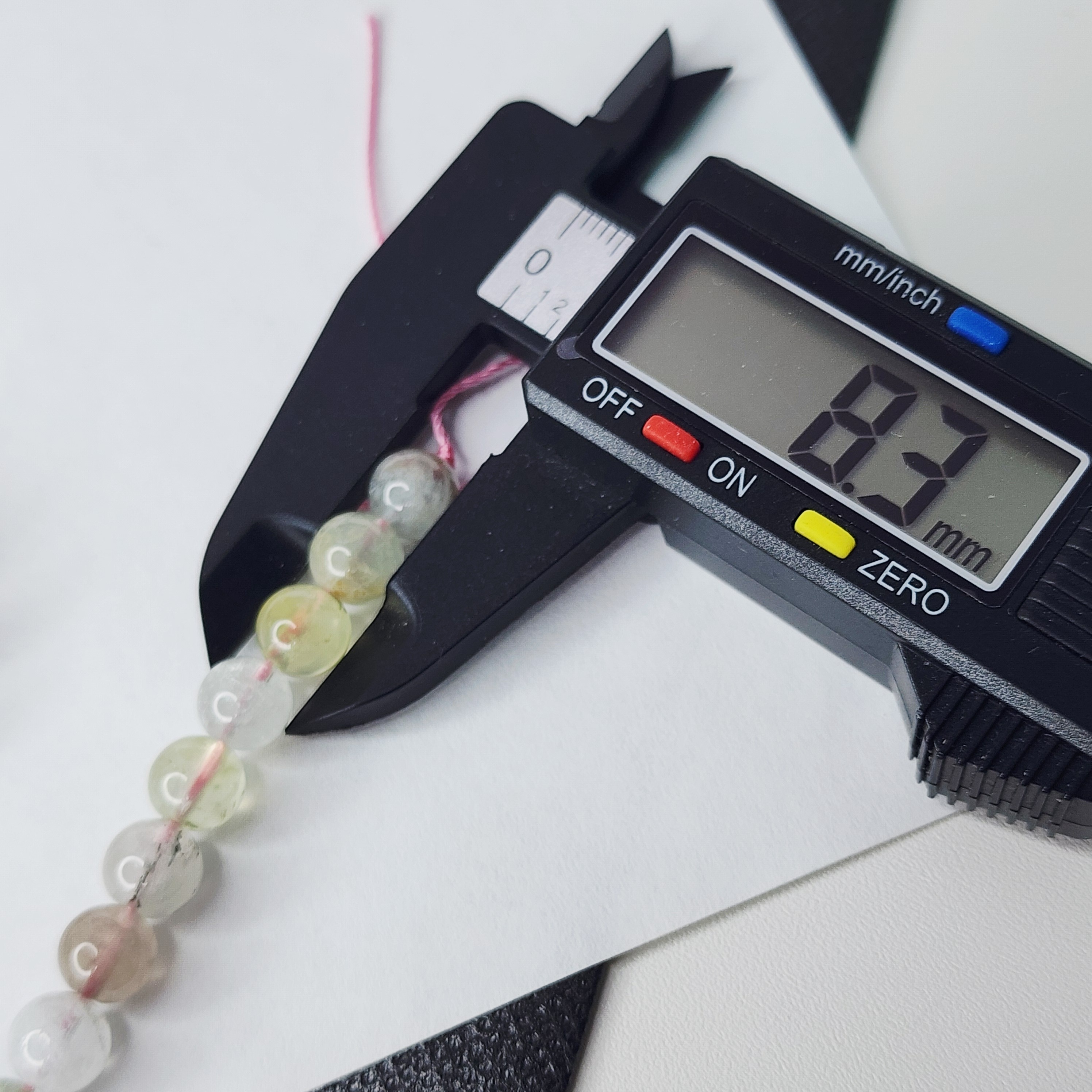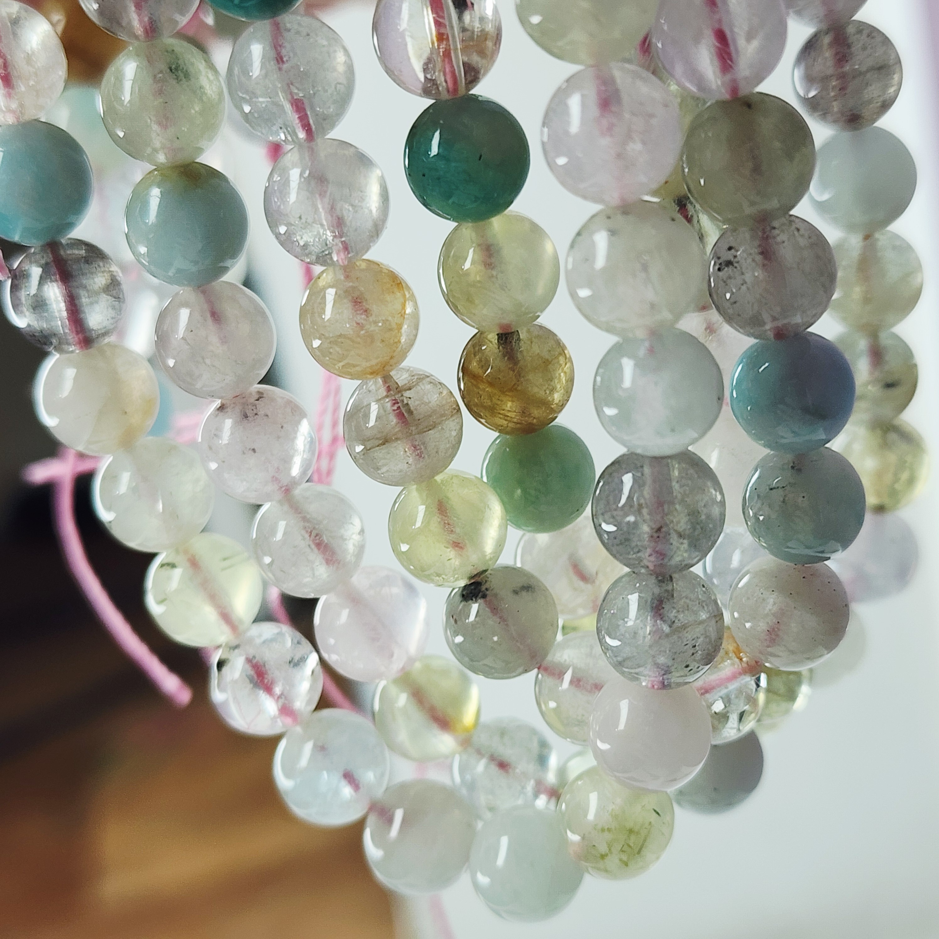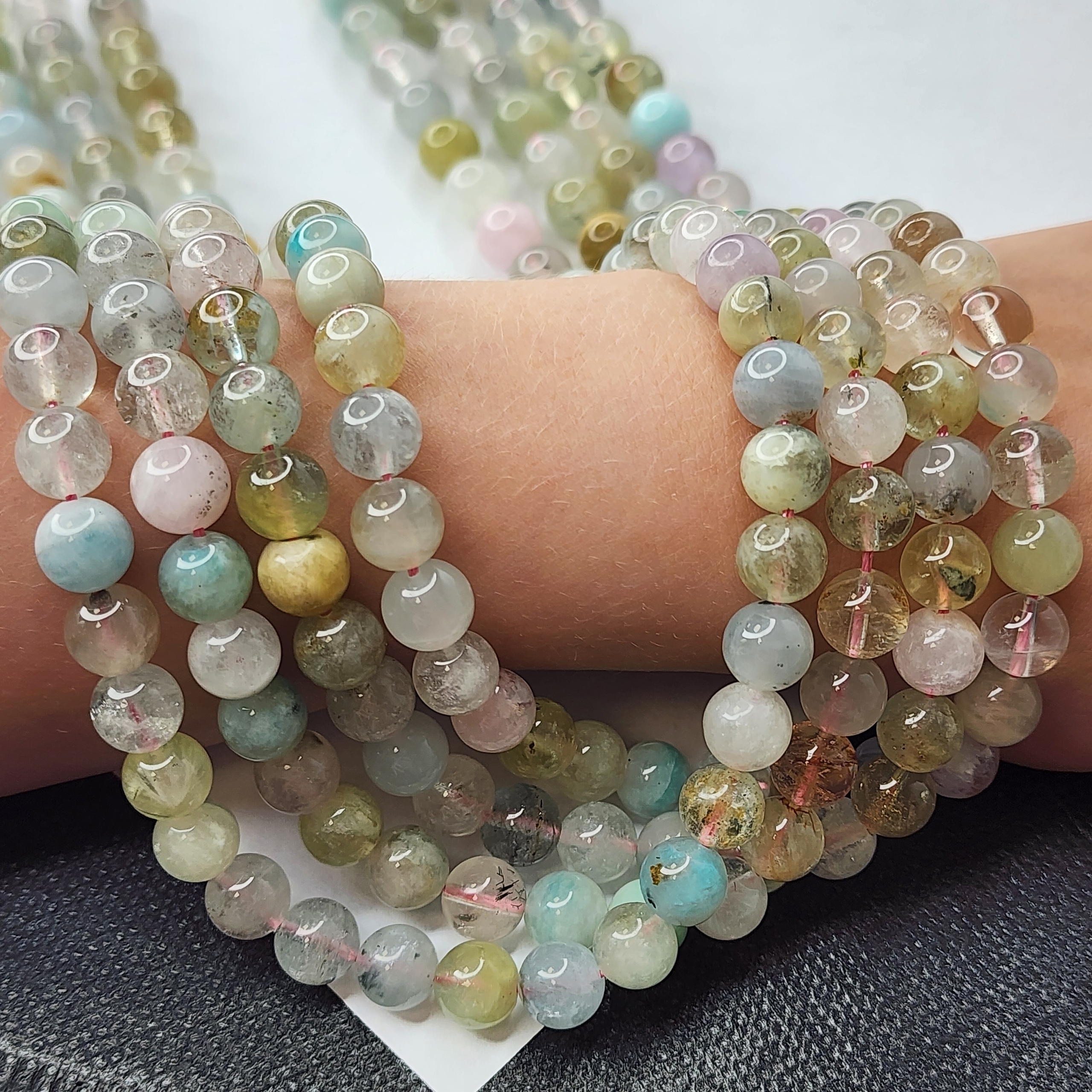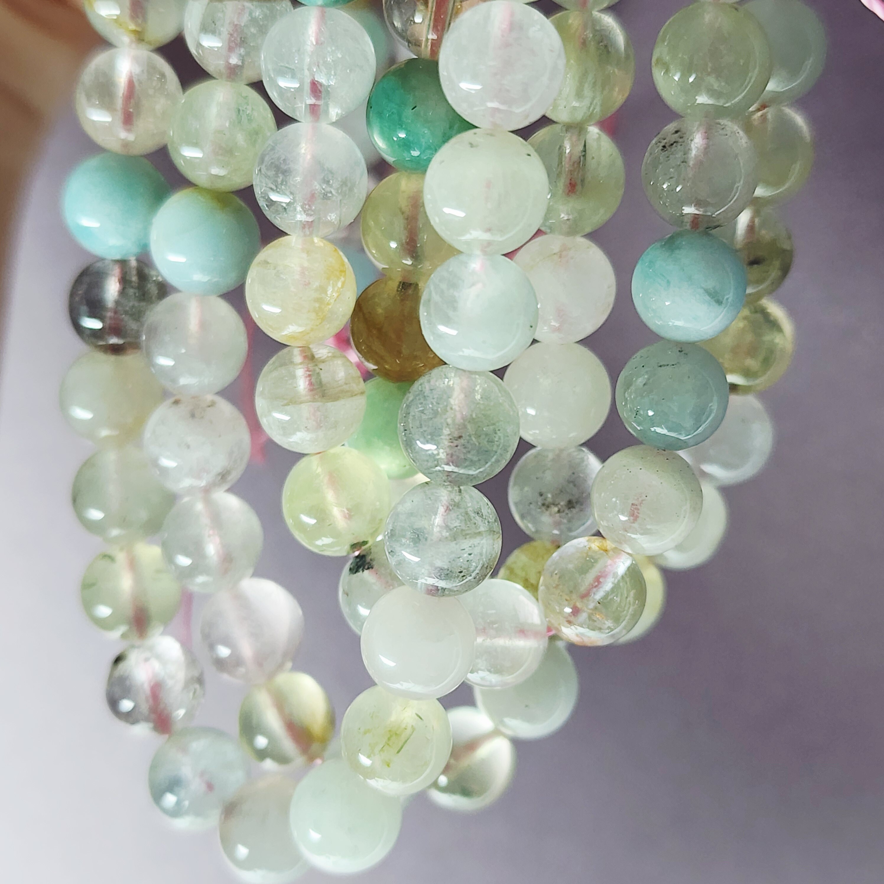 Микс бериллов и кварцев, НЕподкрашенный, с включениями, встречаются также бусинки пренита и амазонита, красивый природный микс, средний размер бусины 8.1 - 8.3мм