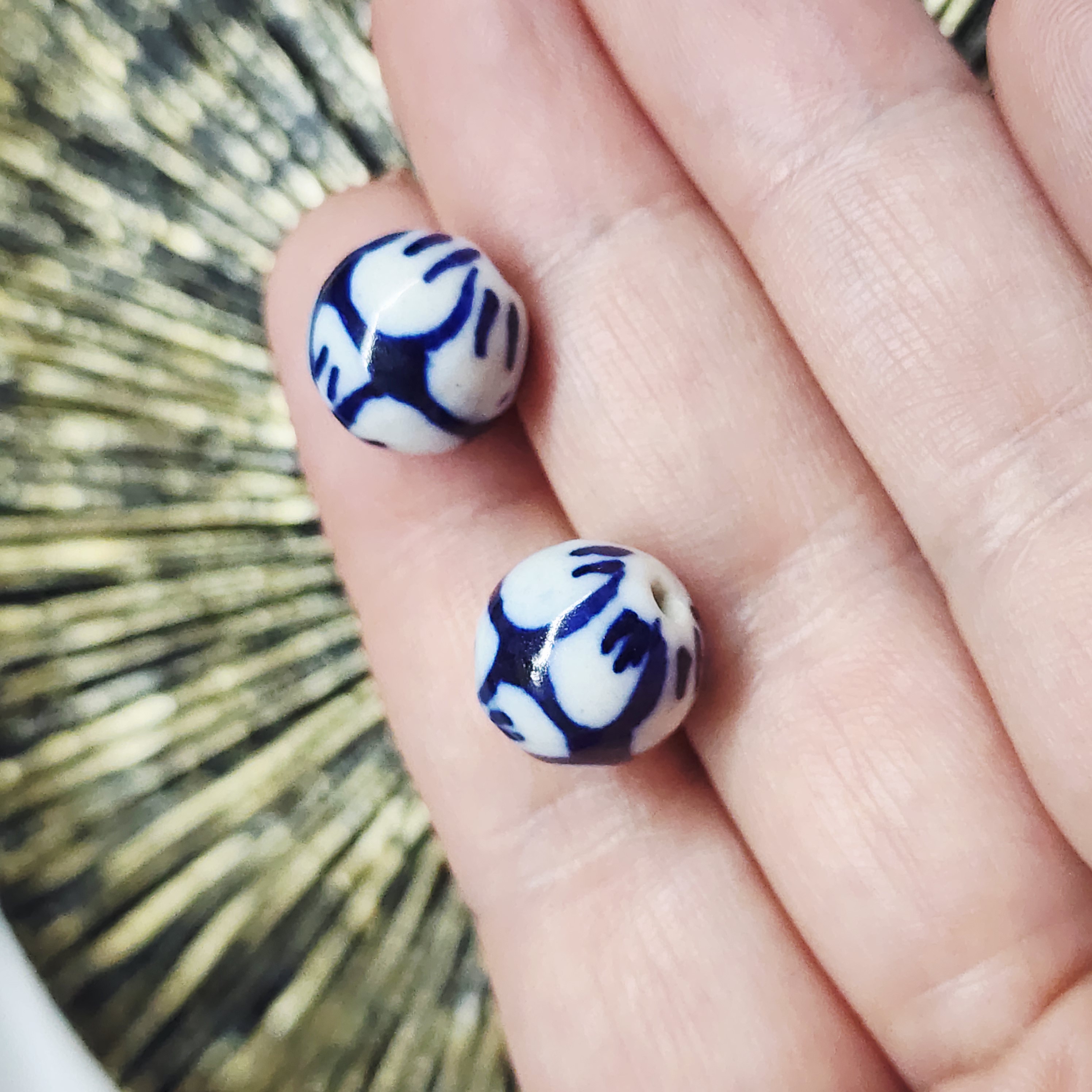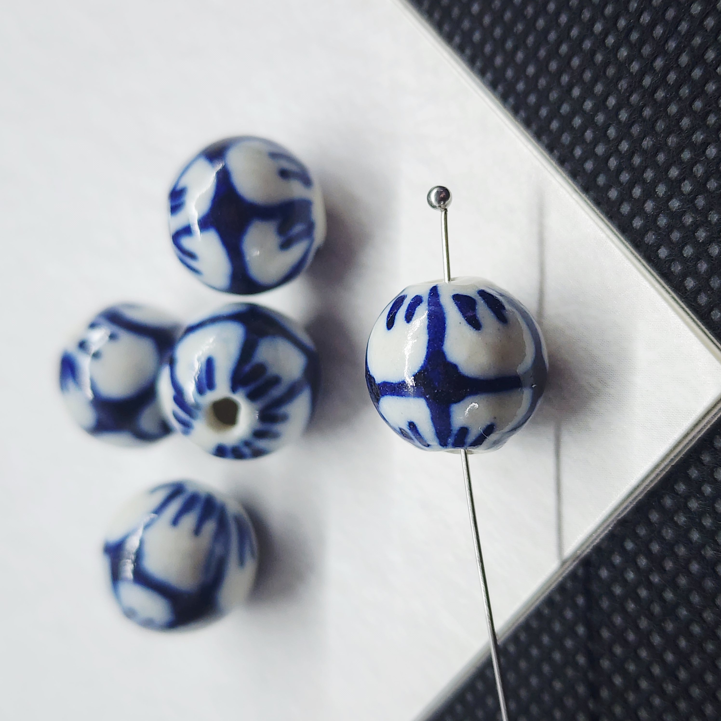 Трендовые бусины с цветочным принтом в темно синем цвете, размер 12- 12.5 мм, отверстие 2 мм.
