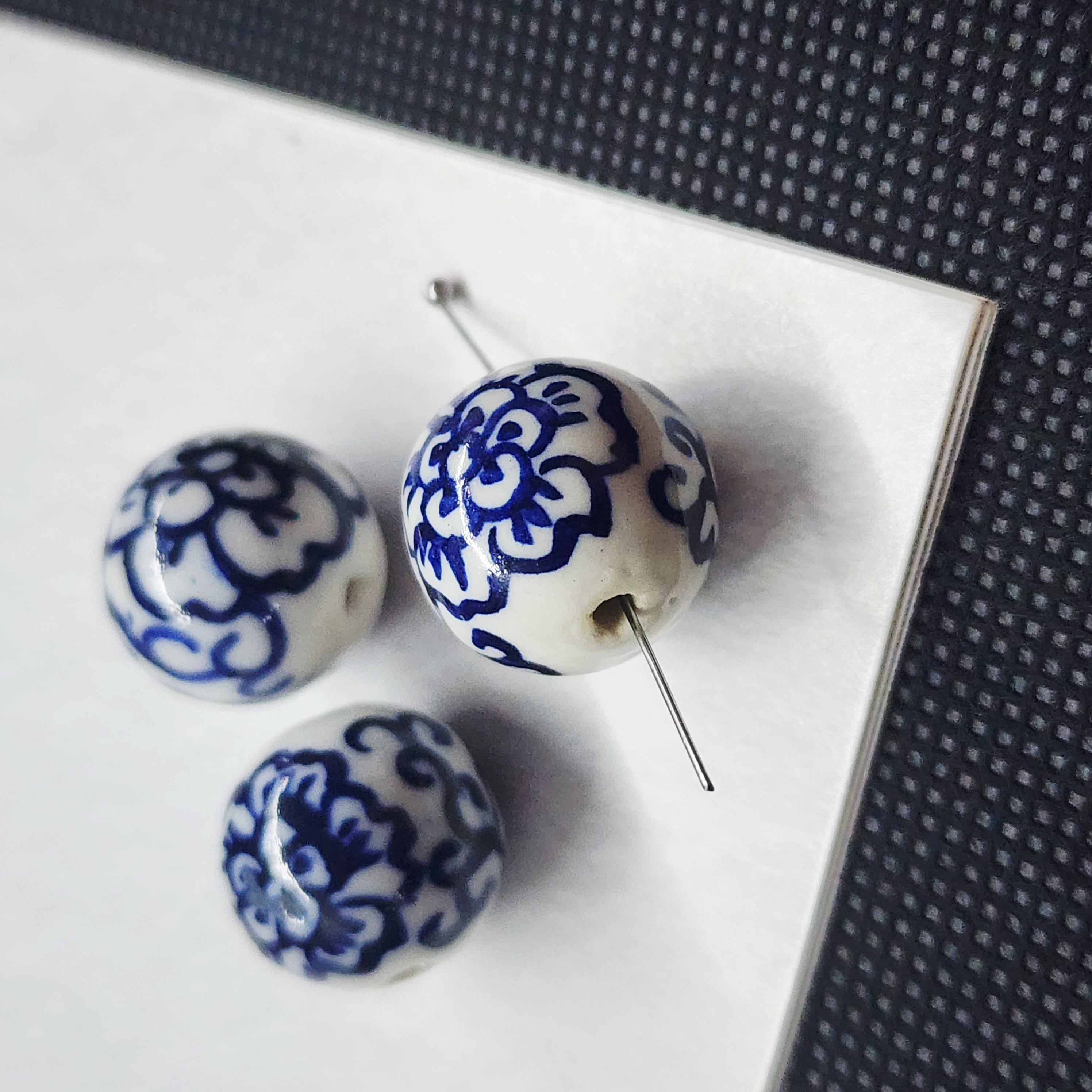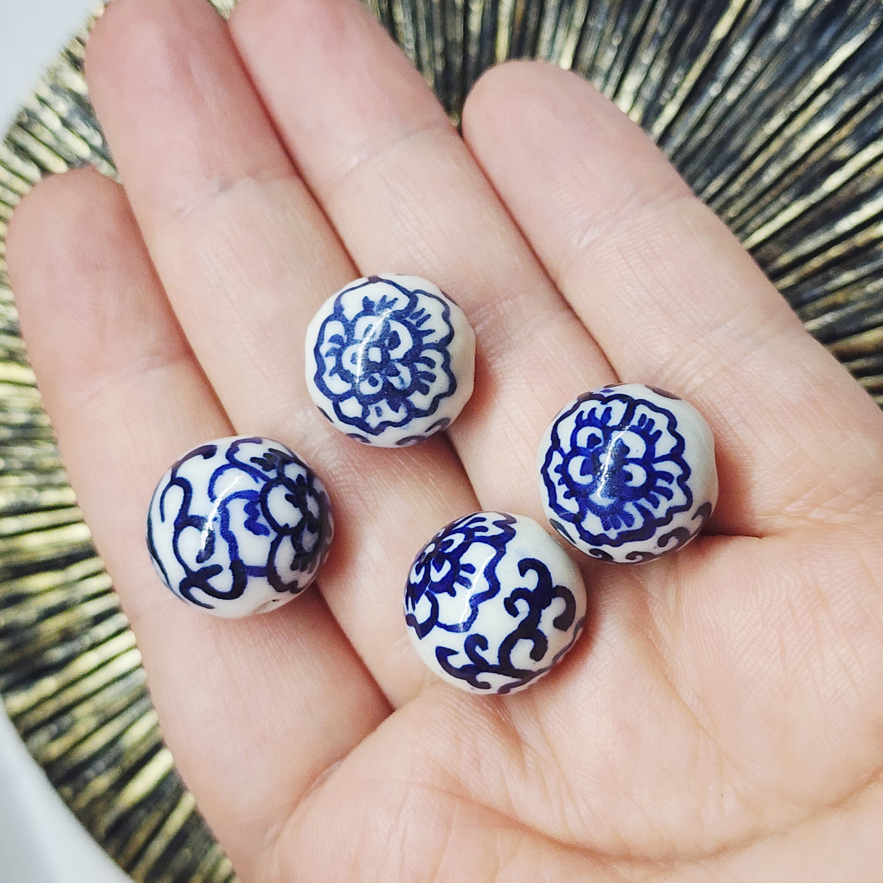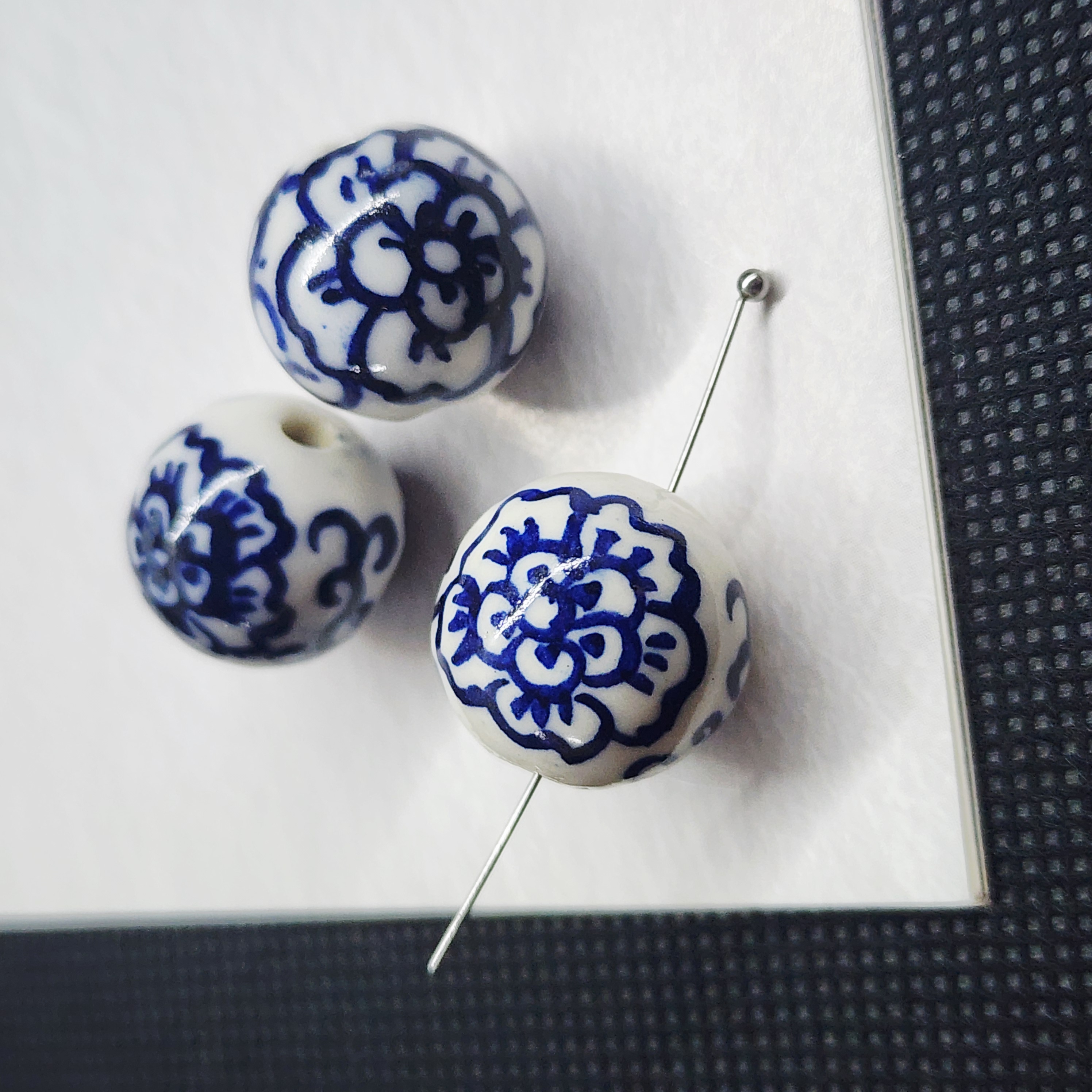 Трендовые бусины с цветочным принтом в темно синем цвете, размер 16 - 16.5 мм, отверстие 2-2.5 мм.