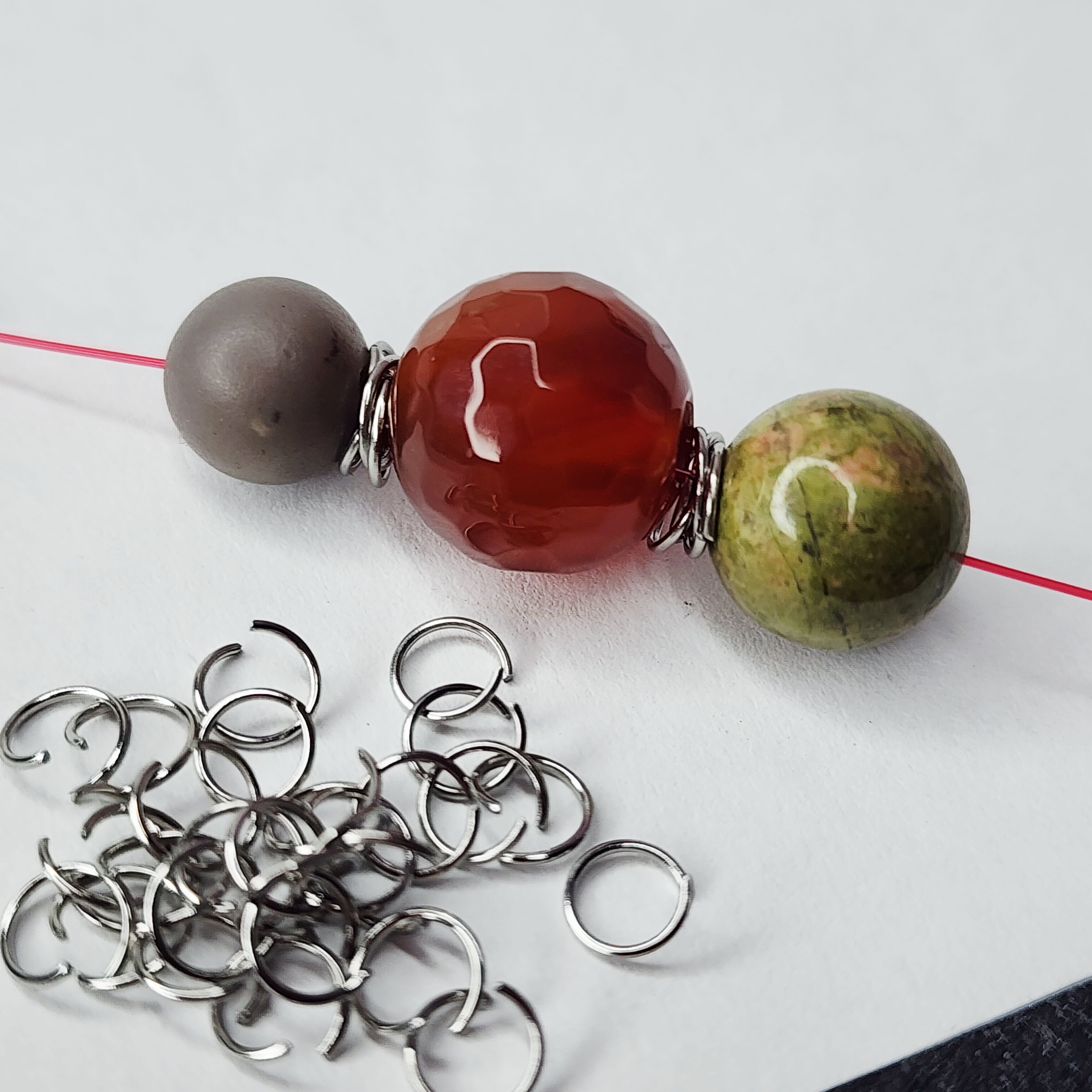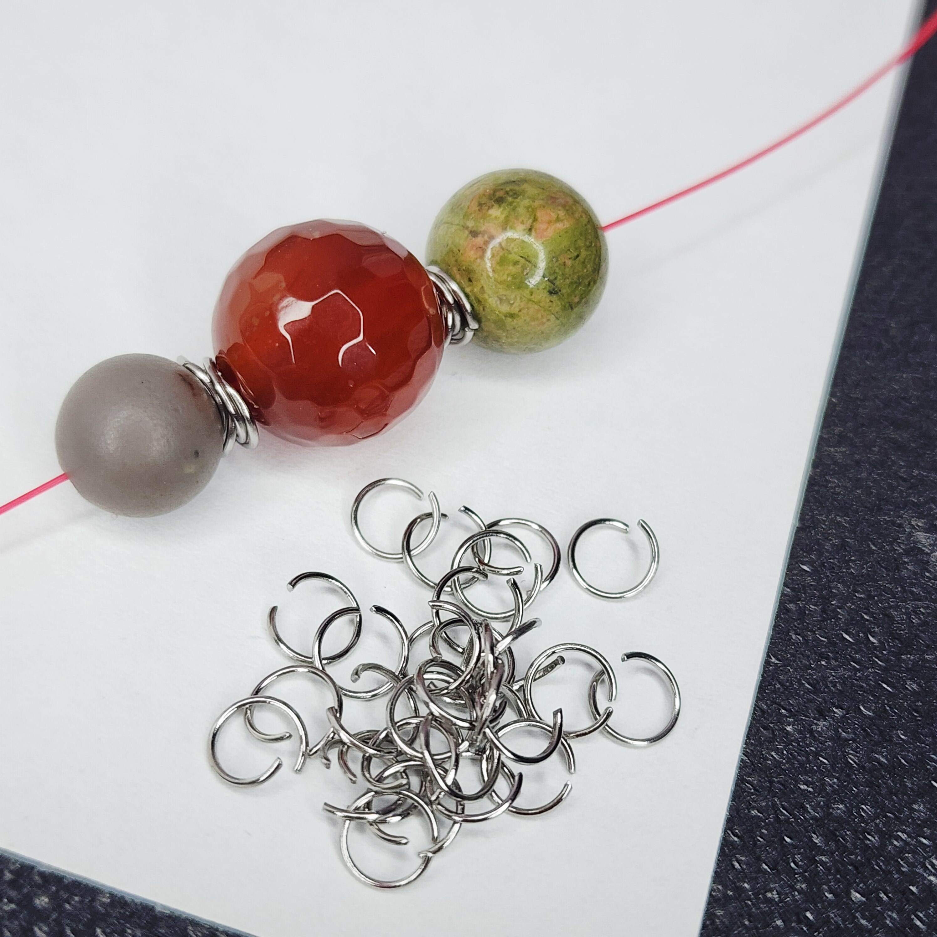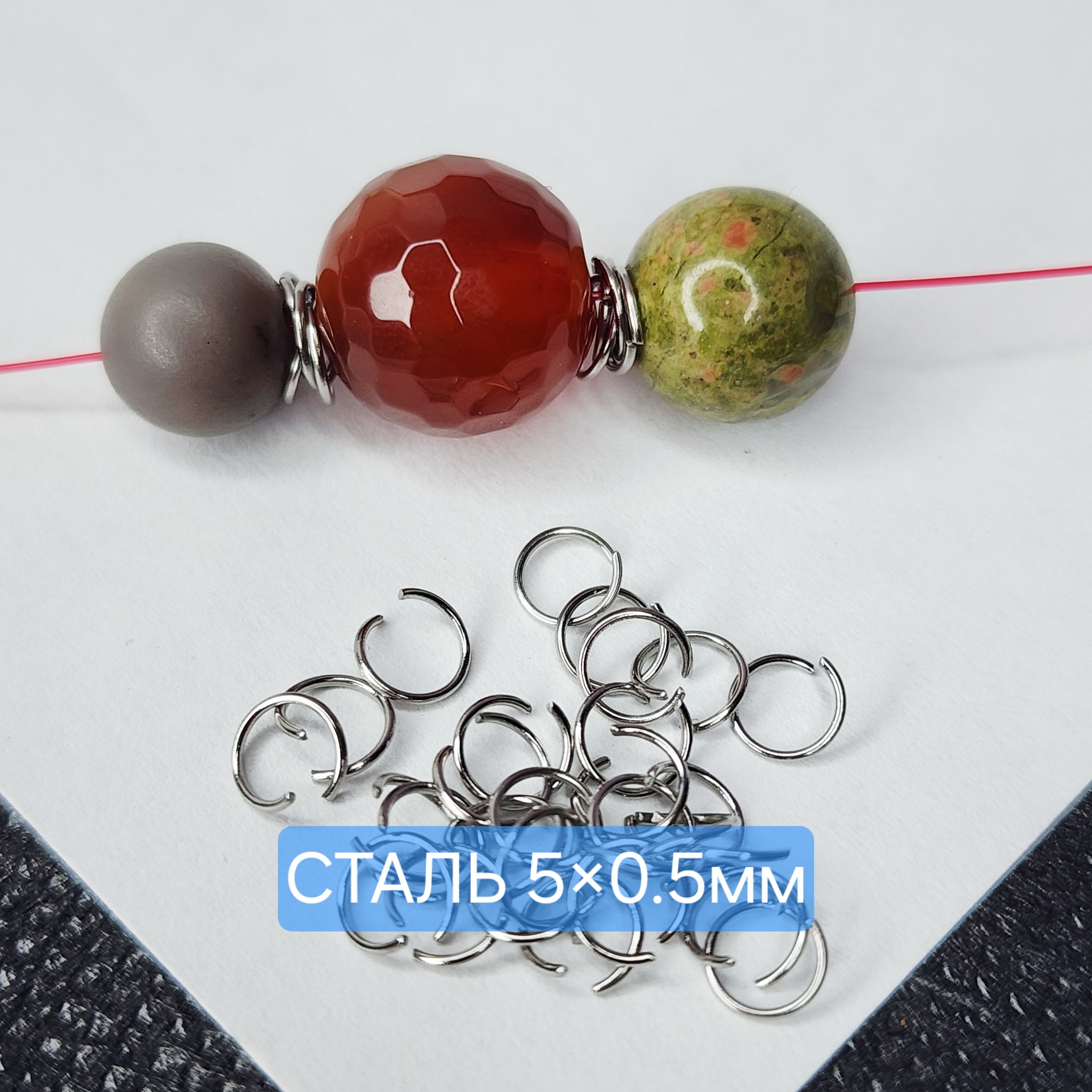 Колечки соединительные, размер 5×0.5мм, их можно использовать и по прямому назначению, а можно как разделители бусин - сцепляя 4 колечка вместе (как на фото) - так получается отличная лёгкая проставка, которая не утяжеляет изделие.