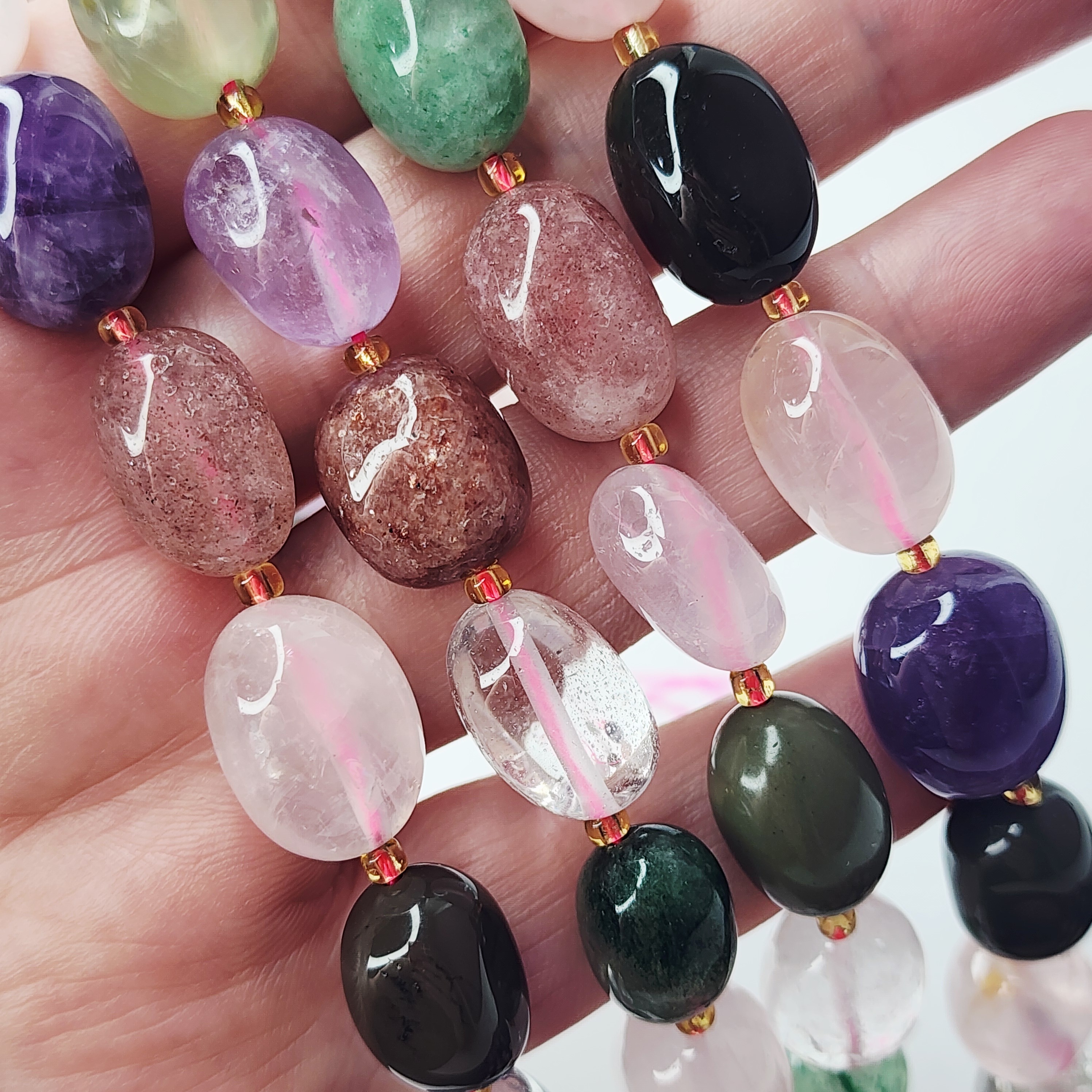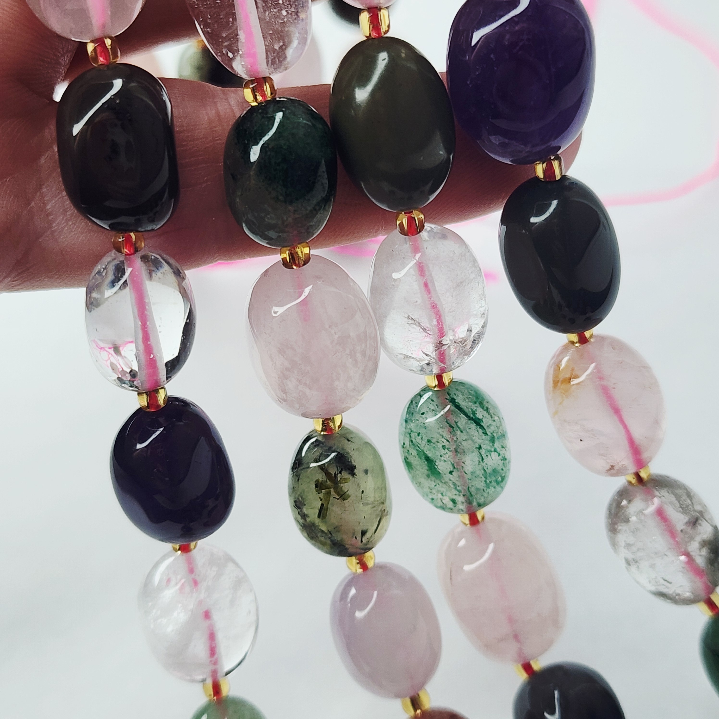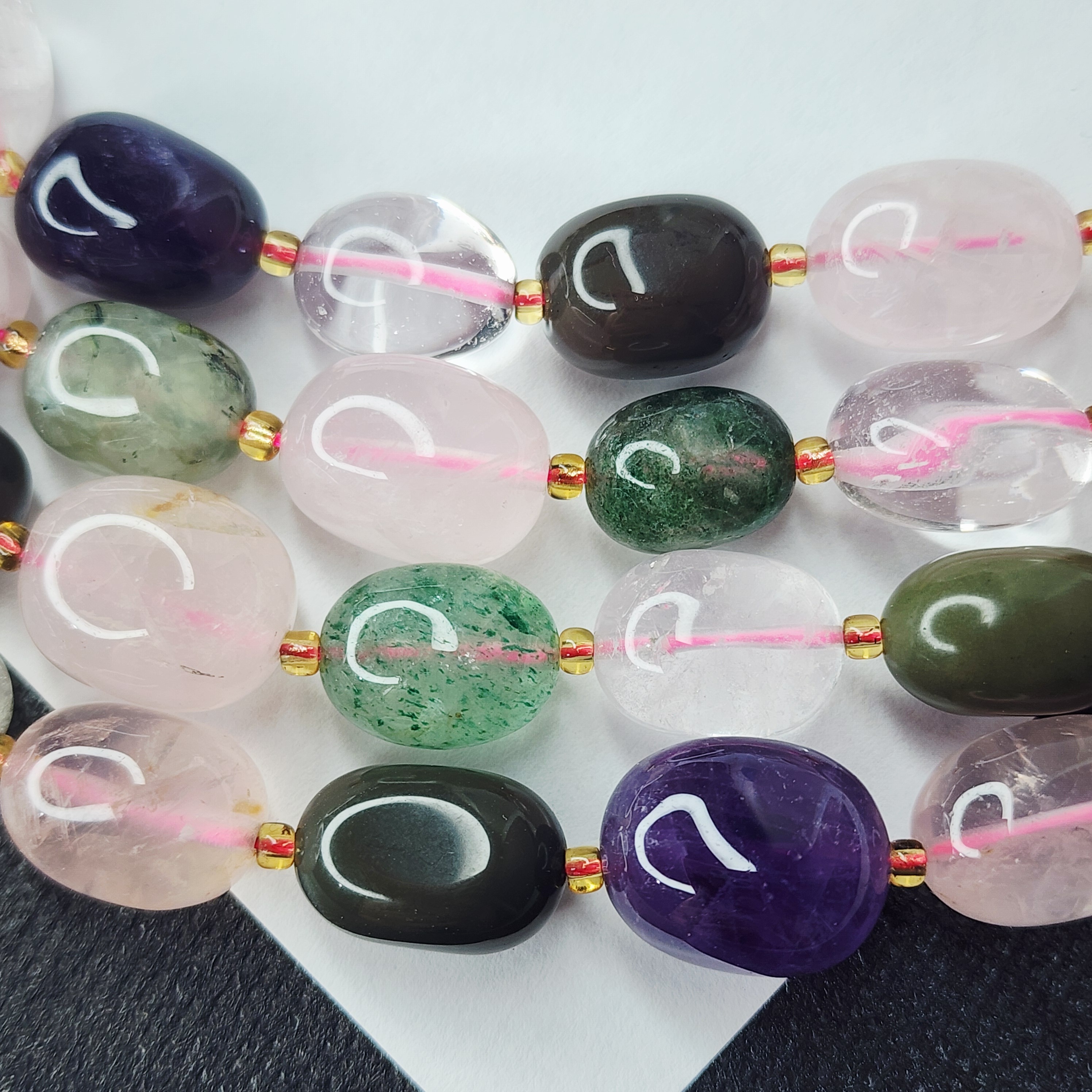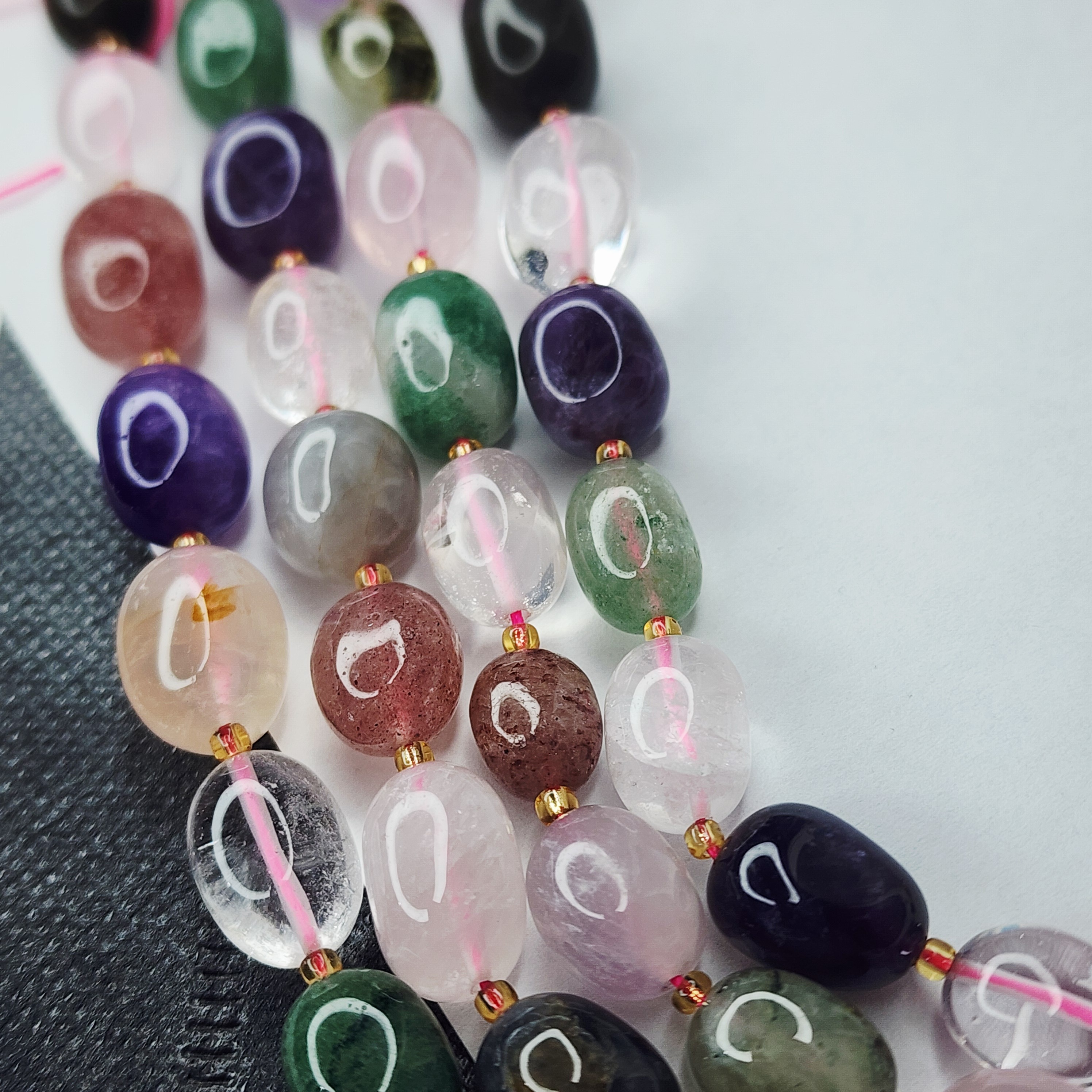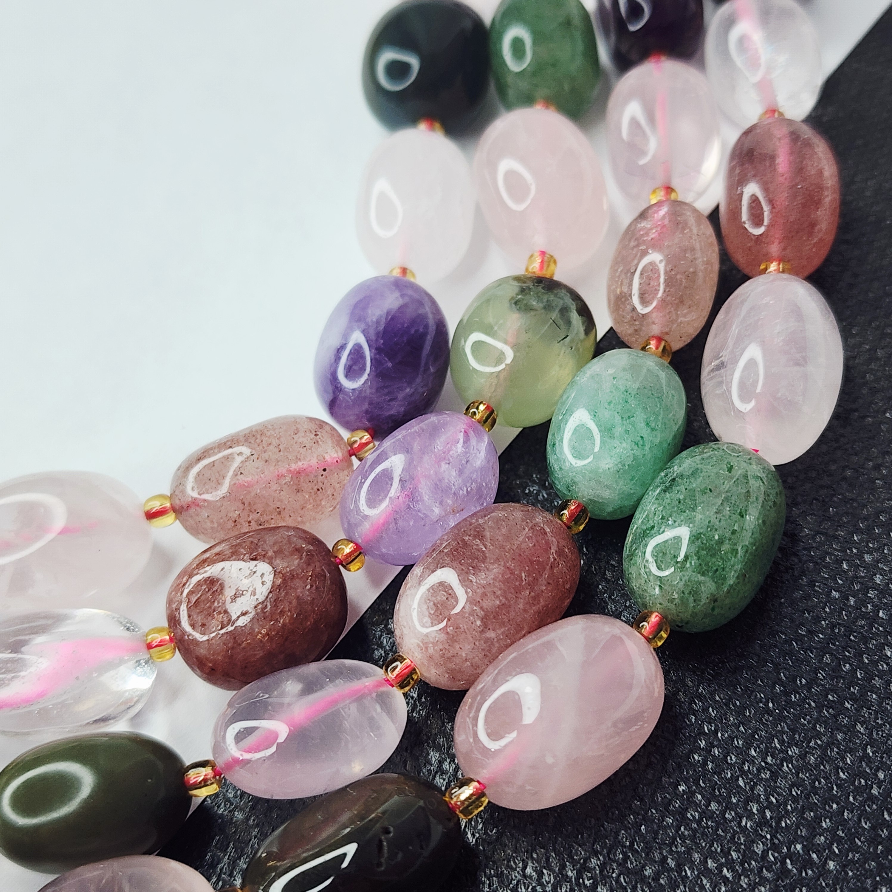 Природные микс кварцев - в нити встечаются аметист, розовый кварц, кварц с включениями гематита ( торговое название клубничный кварц), прозрачный кварц (горный хрусталь), прениты, авантюрины