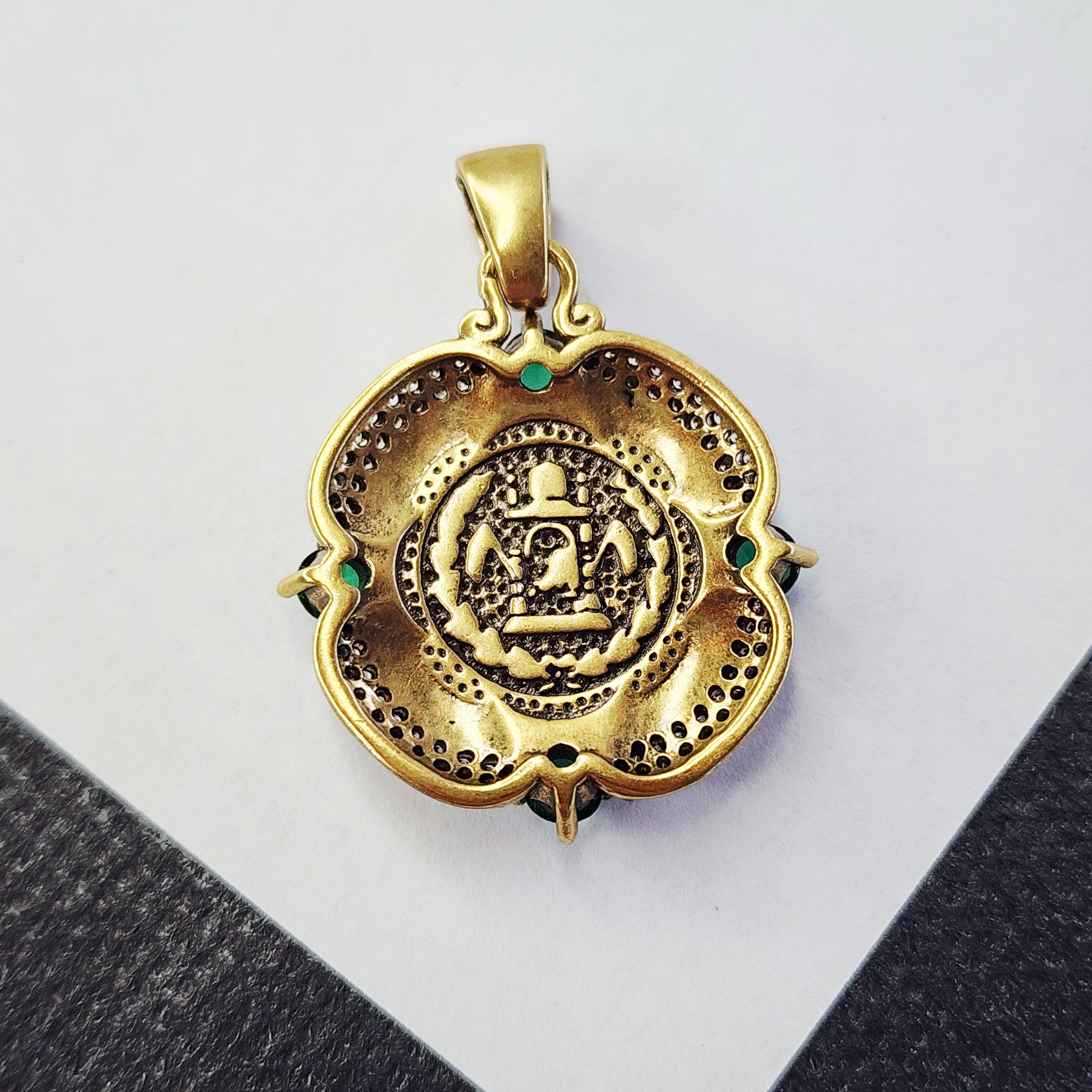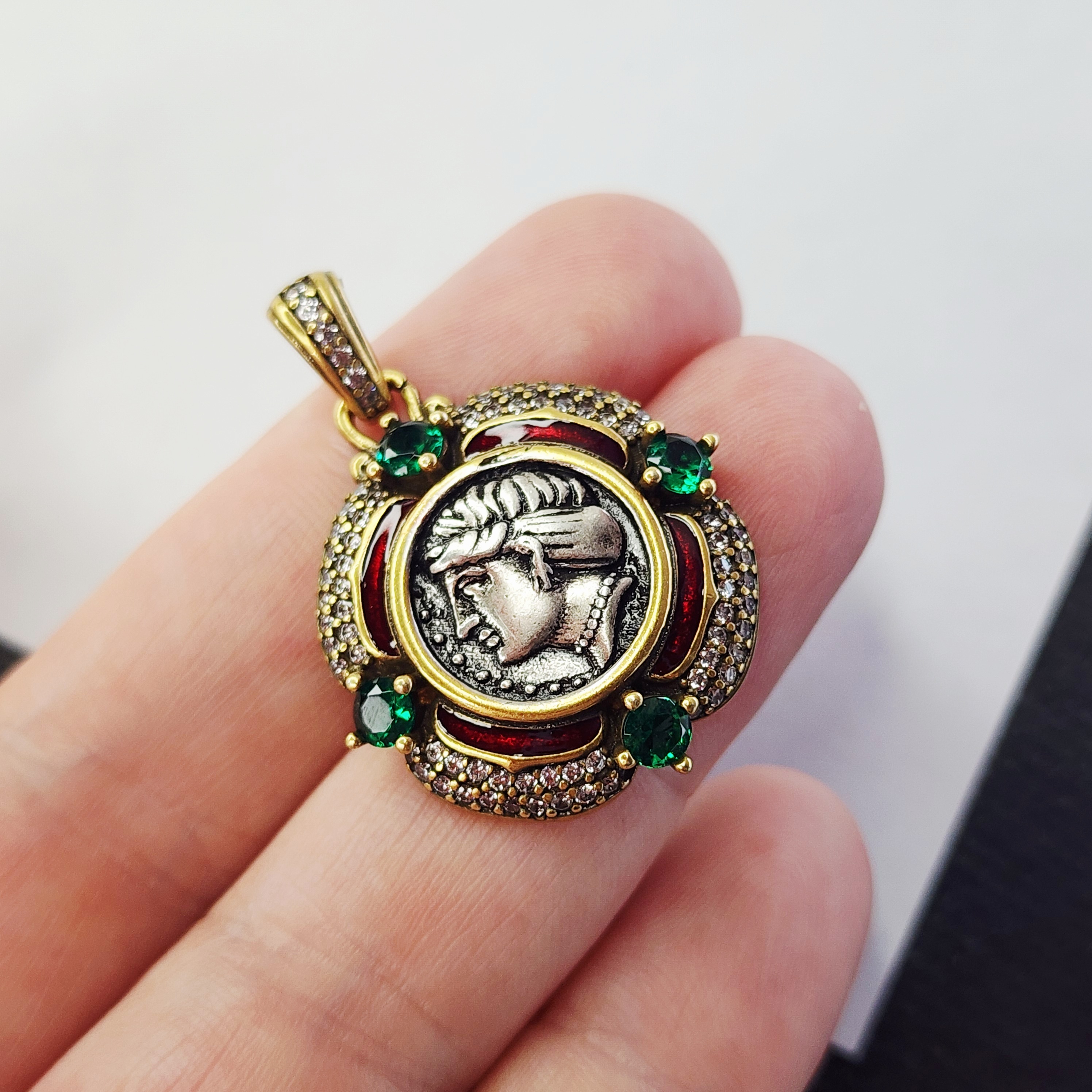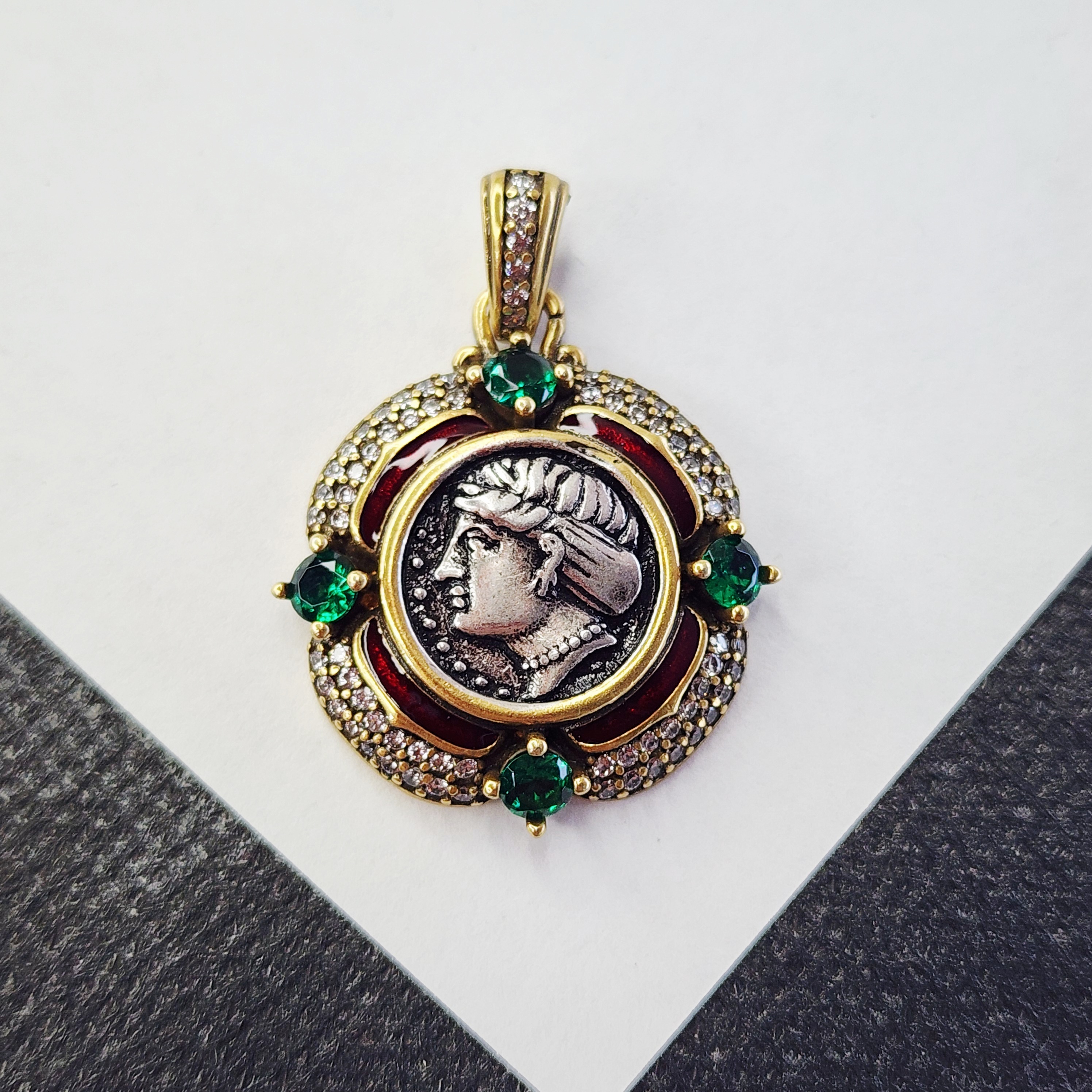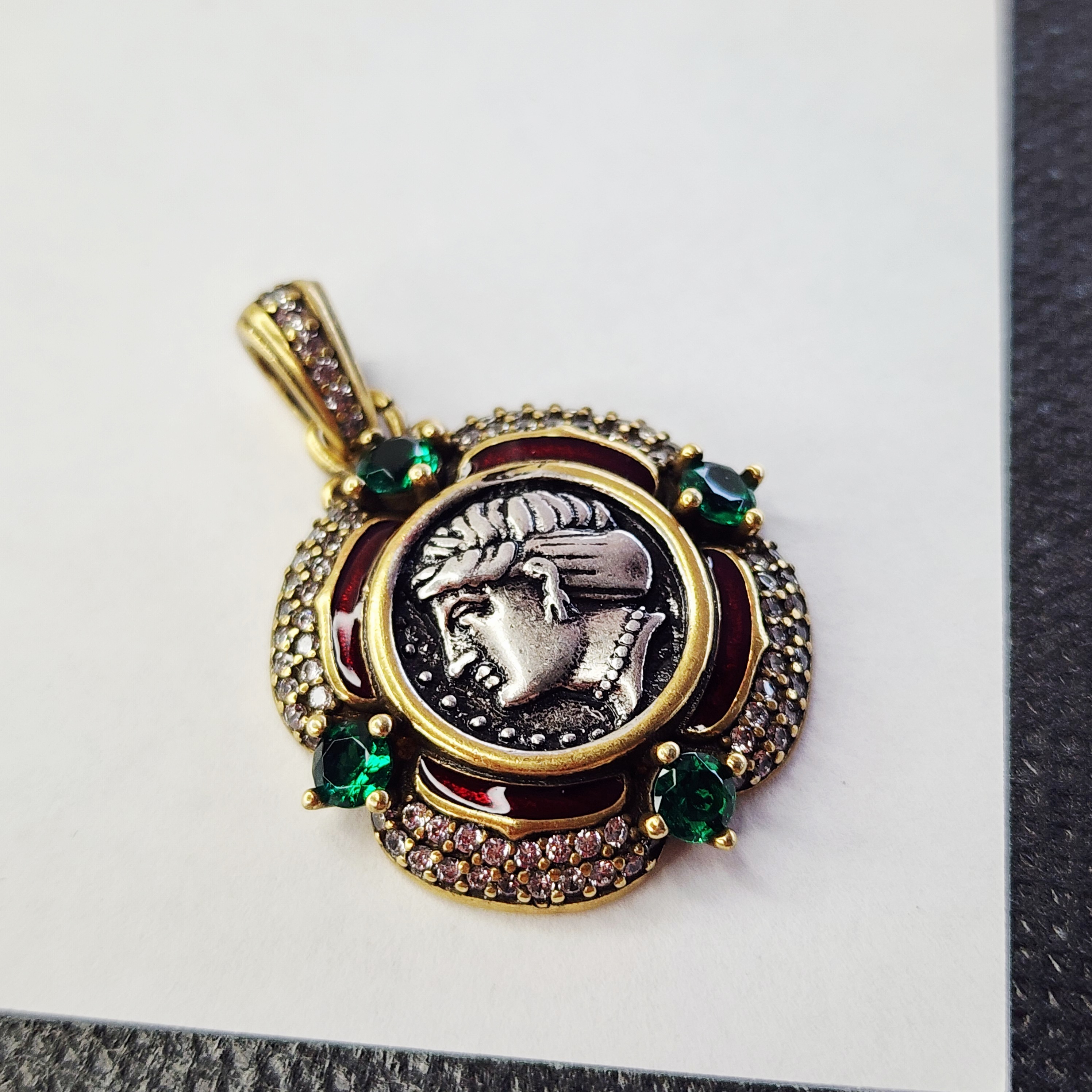 Подвеска - кулон стилизированная под старинную монету, вставки цветное ювелирное стекло оттенка эмеральд, р-р кулона 29×26×4.5мм
