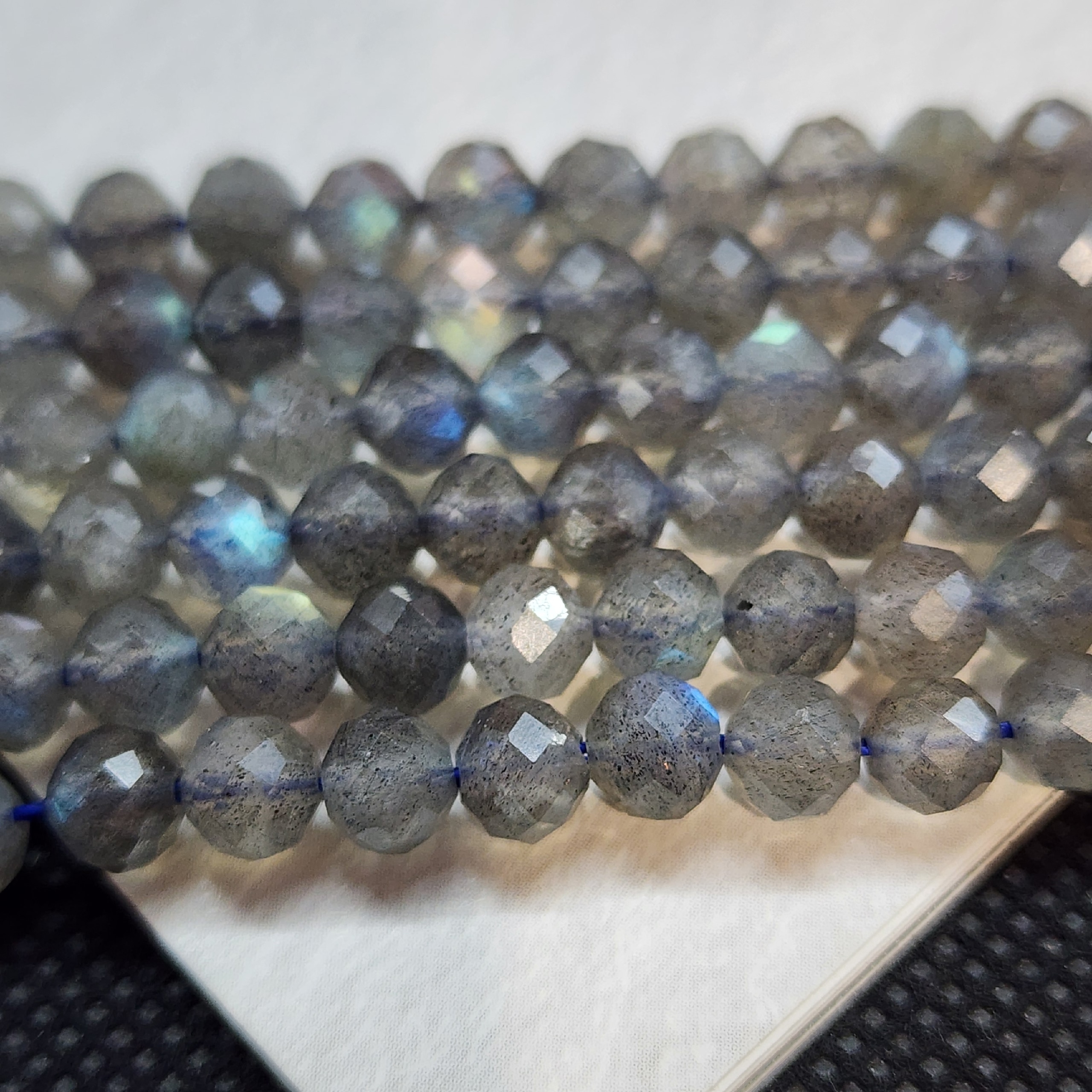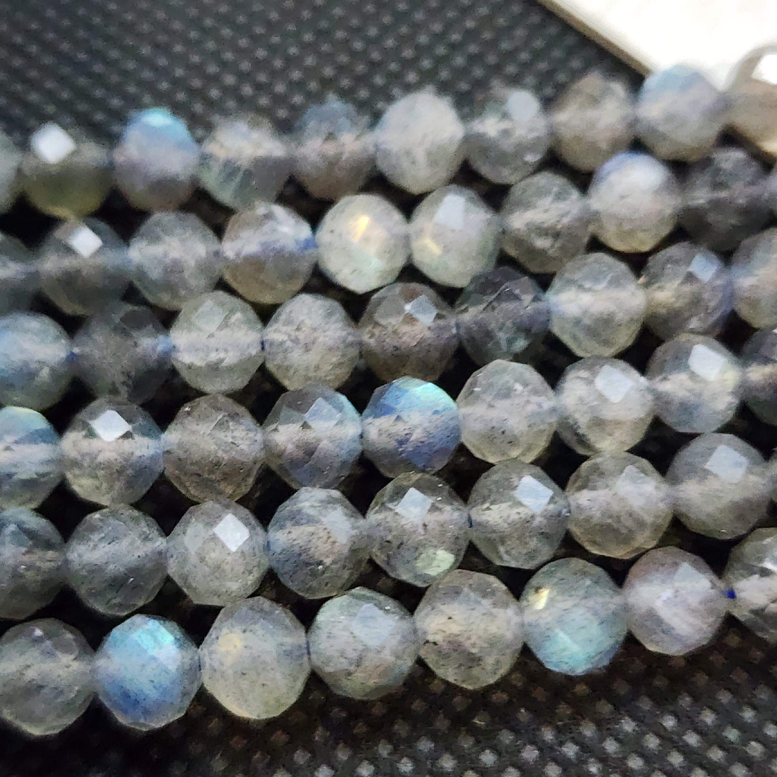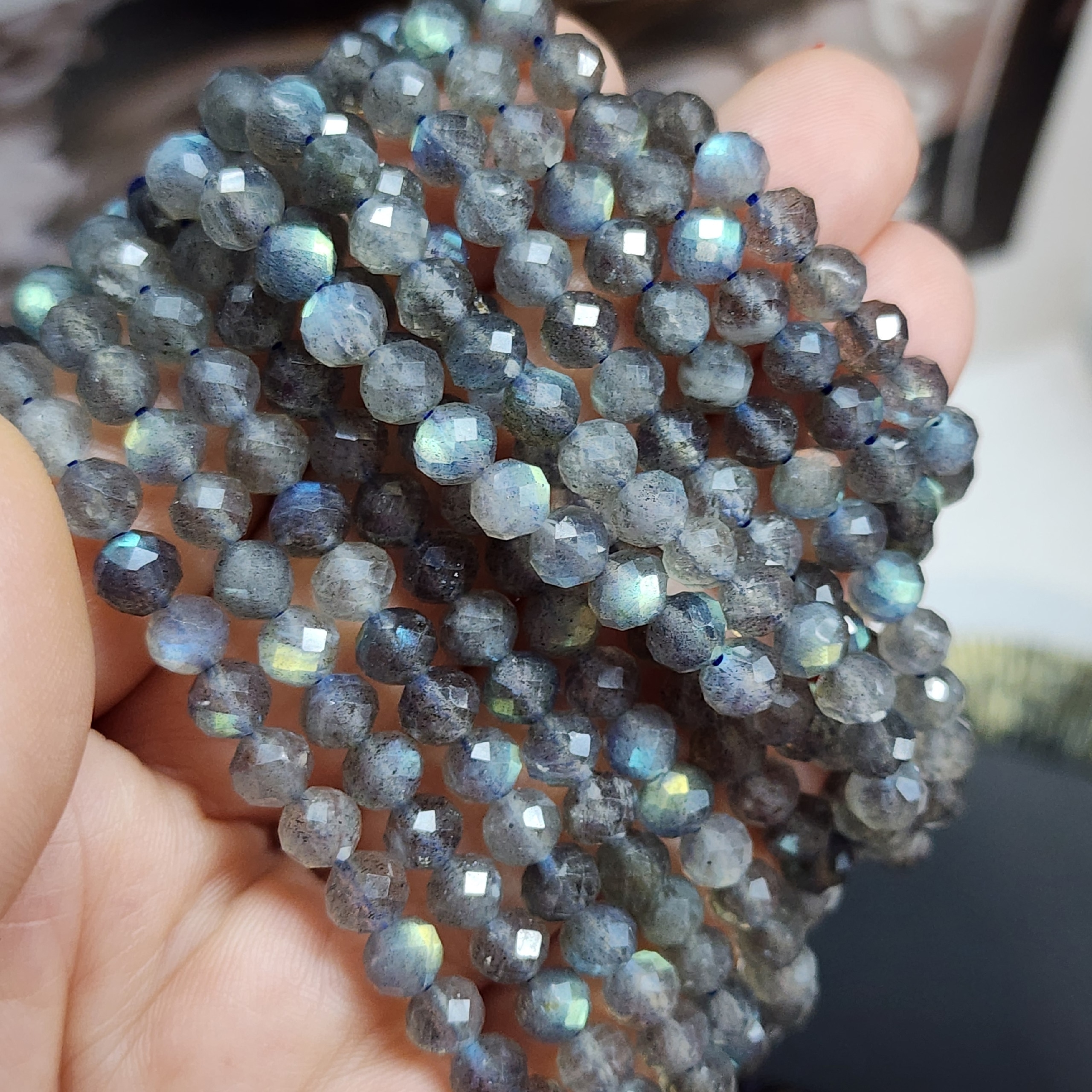 Бусины из лабрадора (полевого шпата группы плагиоклазов) с выраженной иризацией. Характерные переливы обусловлены внутренним строением кристалла — тонкими пластинчатыми включениями, отражающими свет. Размер, форма и интенсивность игры цвета варьируются, подчёркивая природное происхождение камня.