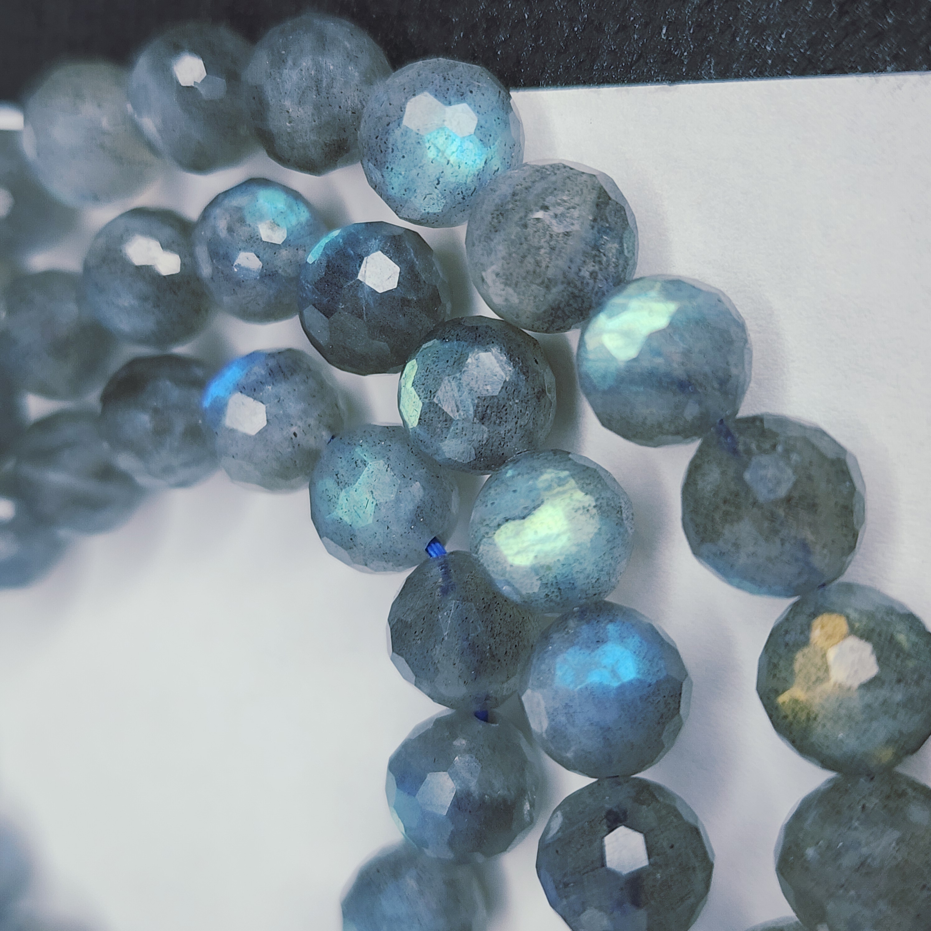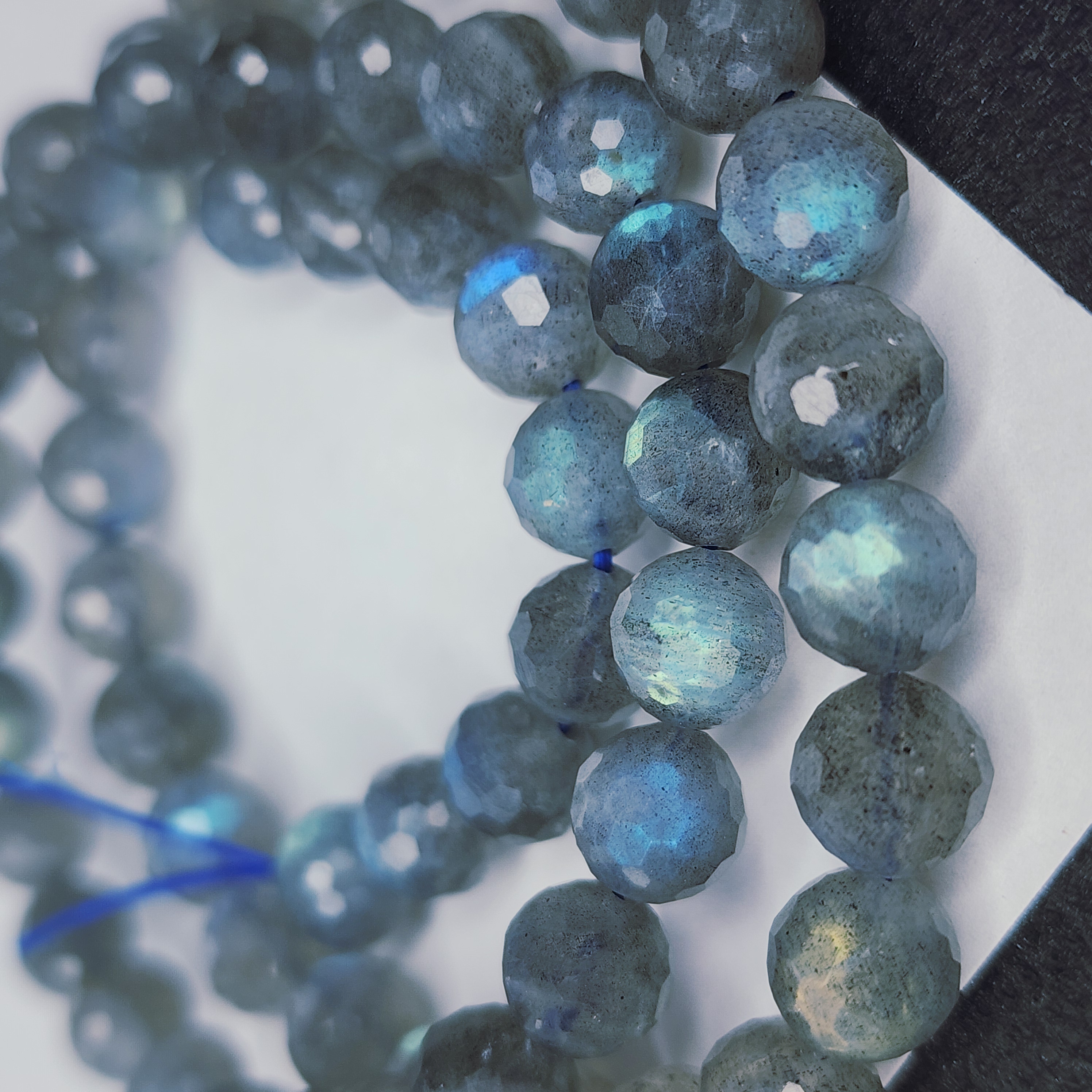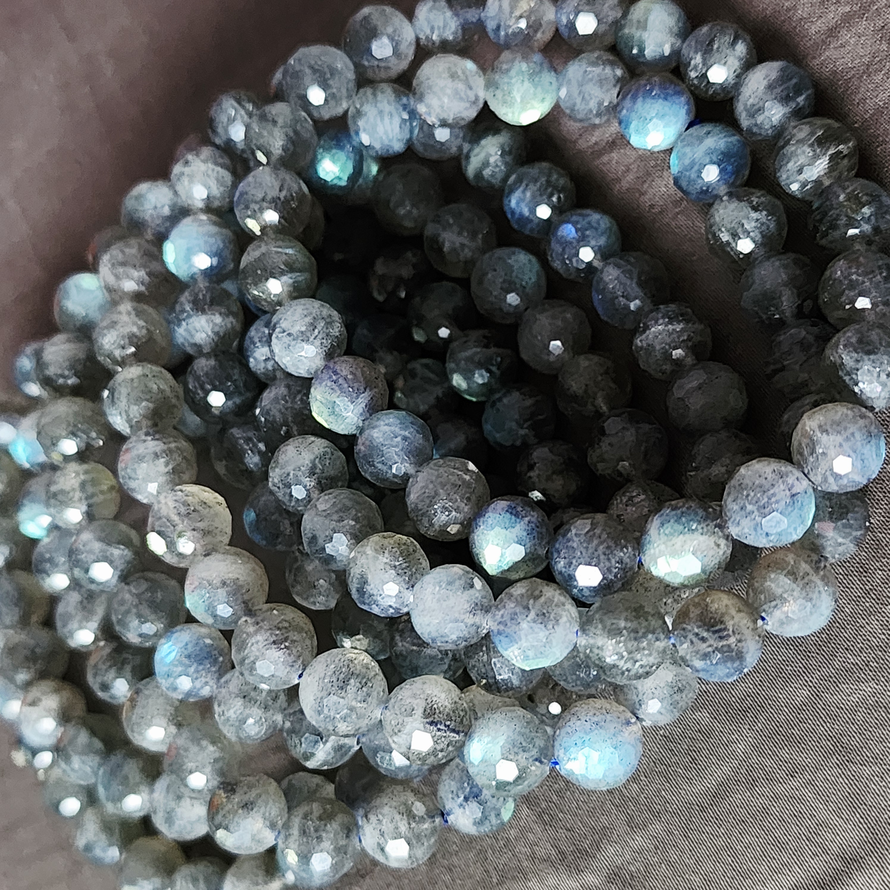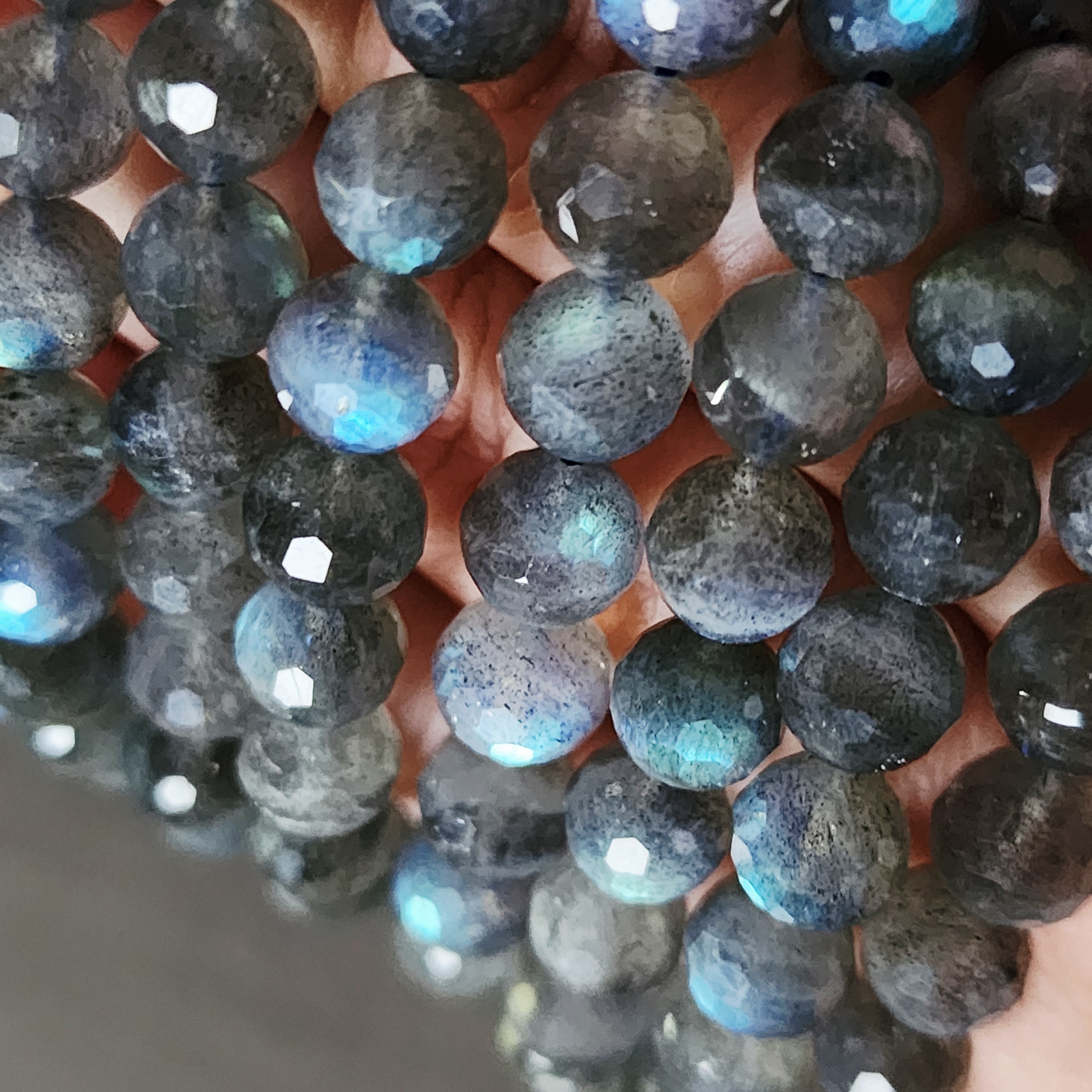 Бусина из лабрадора (полевого шпата группы плагиоклазов) с выраженной иризацией. Характерные переливы обусловлены внутренним строением кристалла — тонкими пластинчатыми включениями, отражающими свет. Размер, форма и интенсивность игры цвета варьируются, подчёркивая природное происхождение камня.
