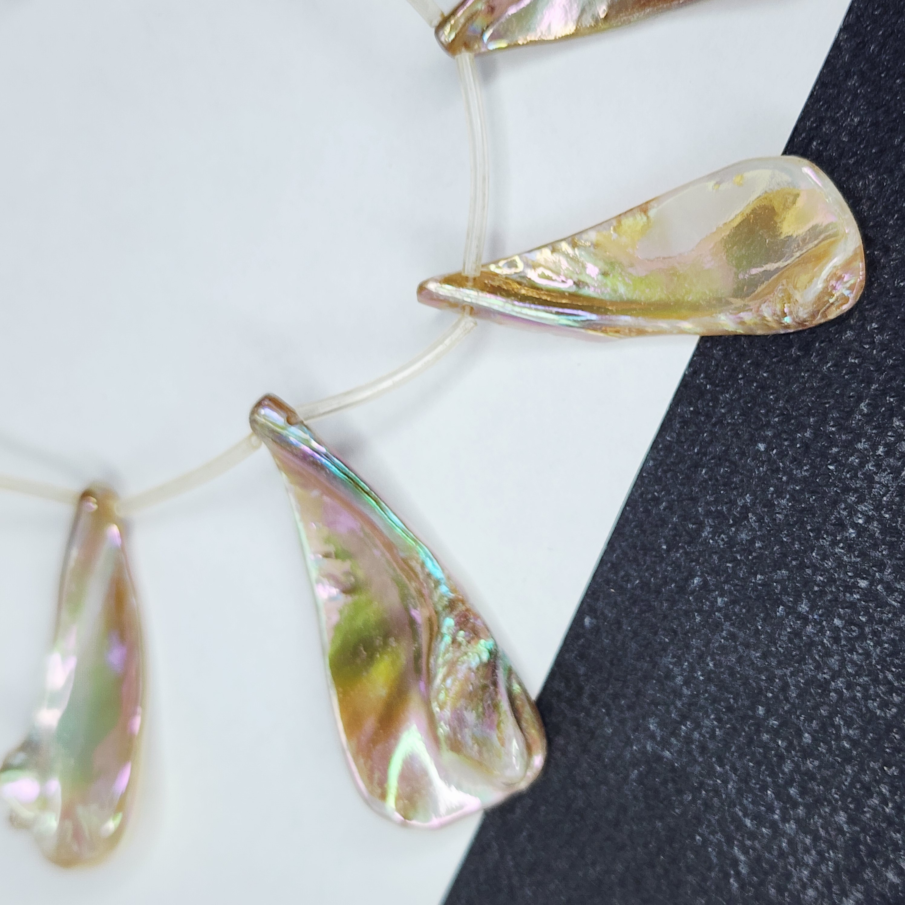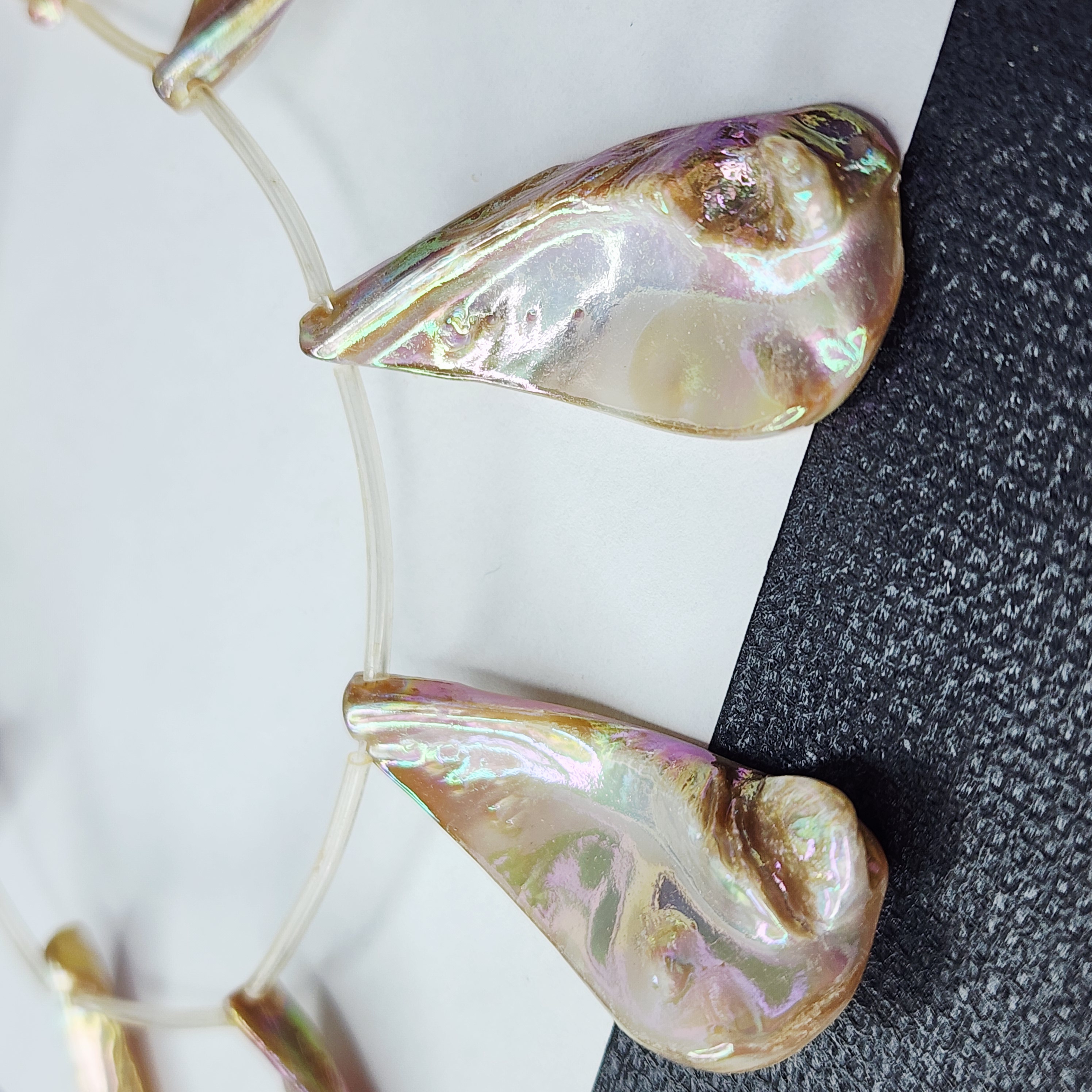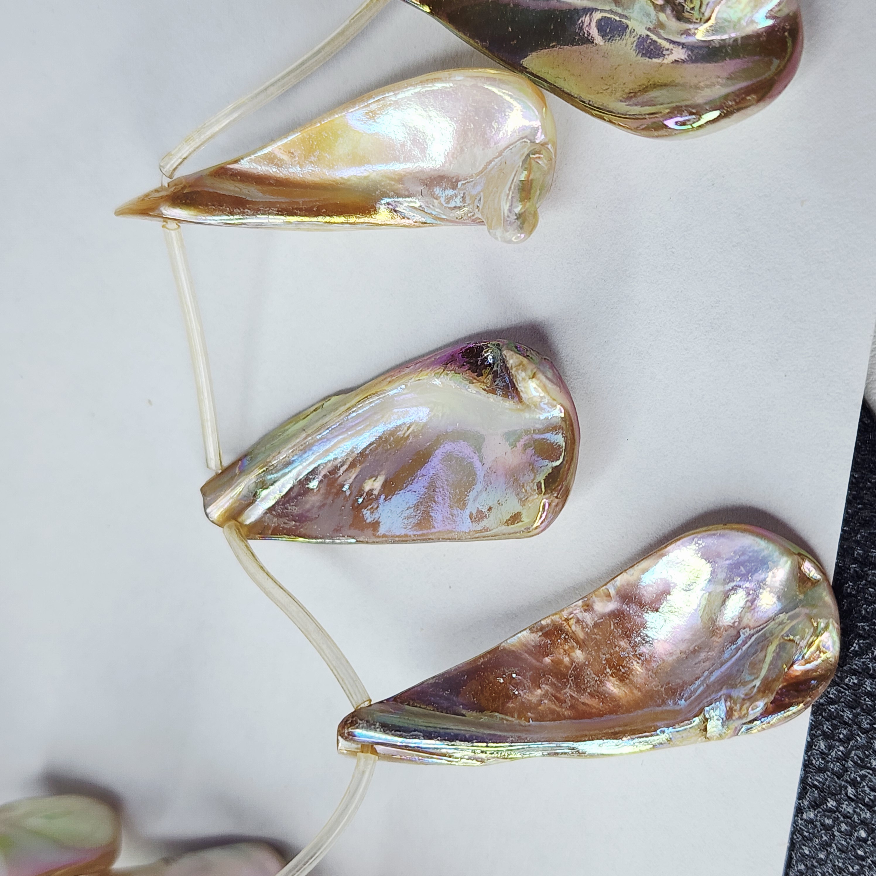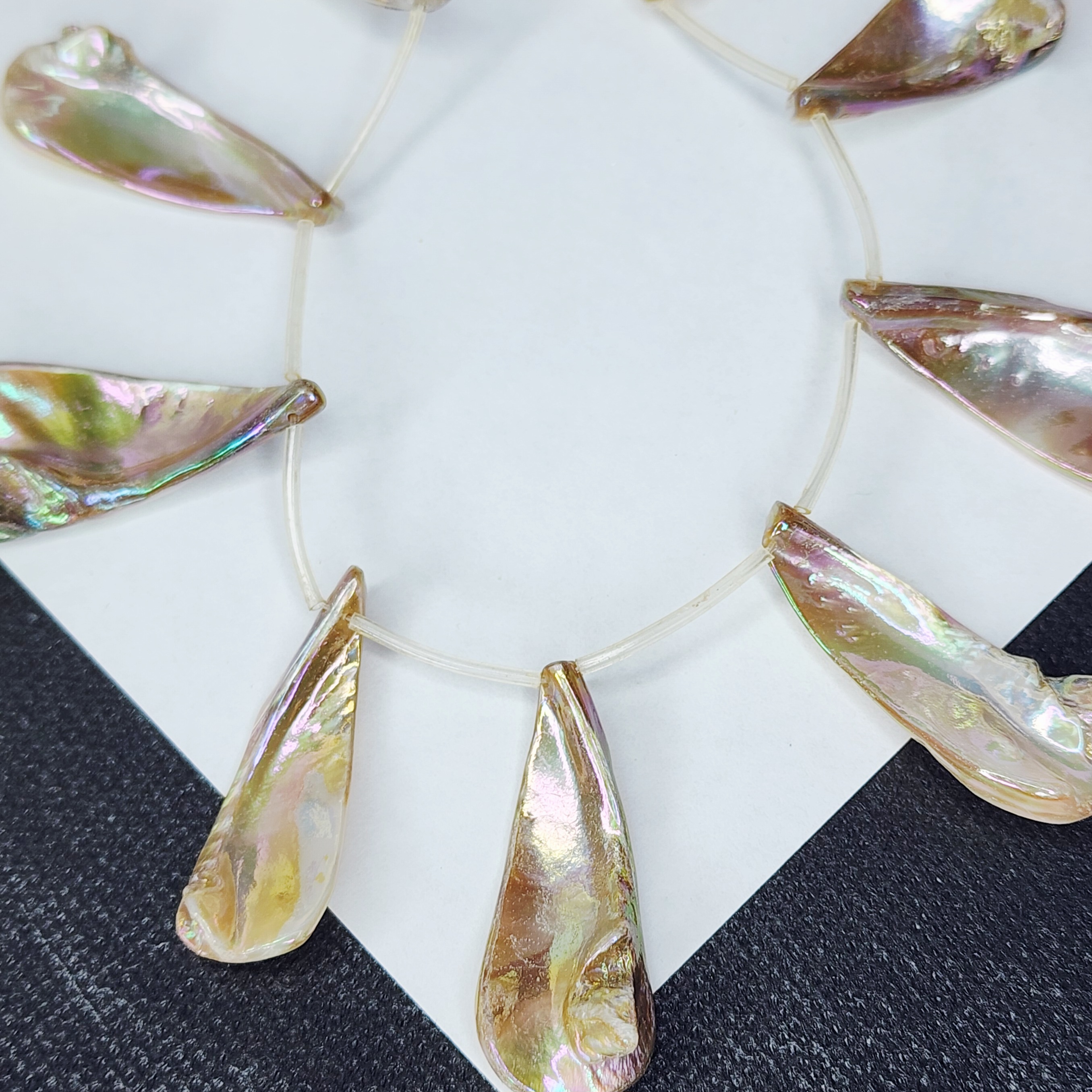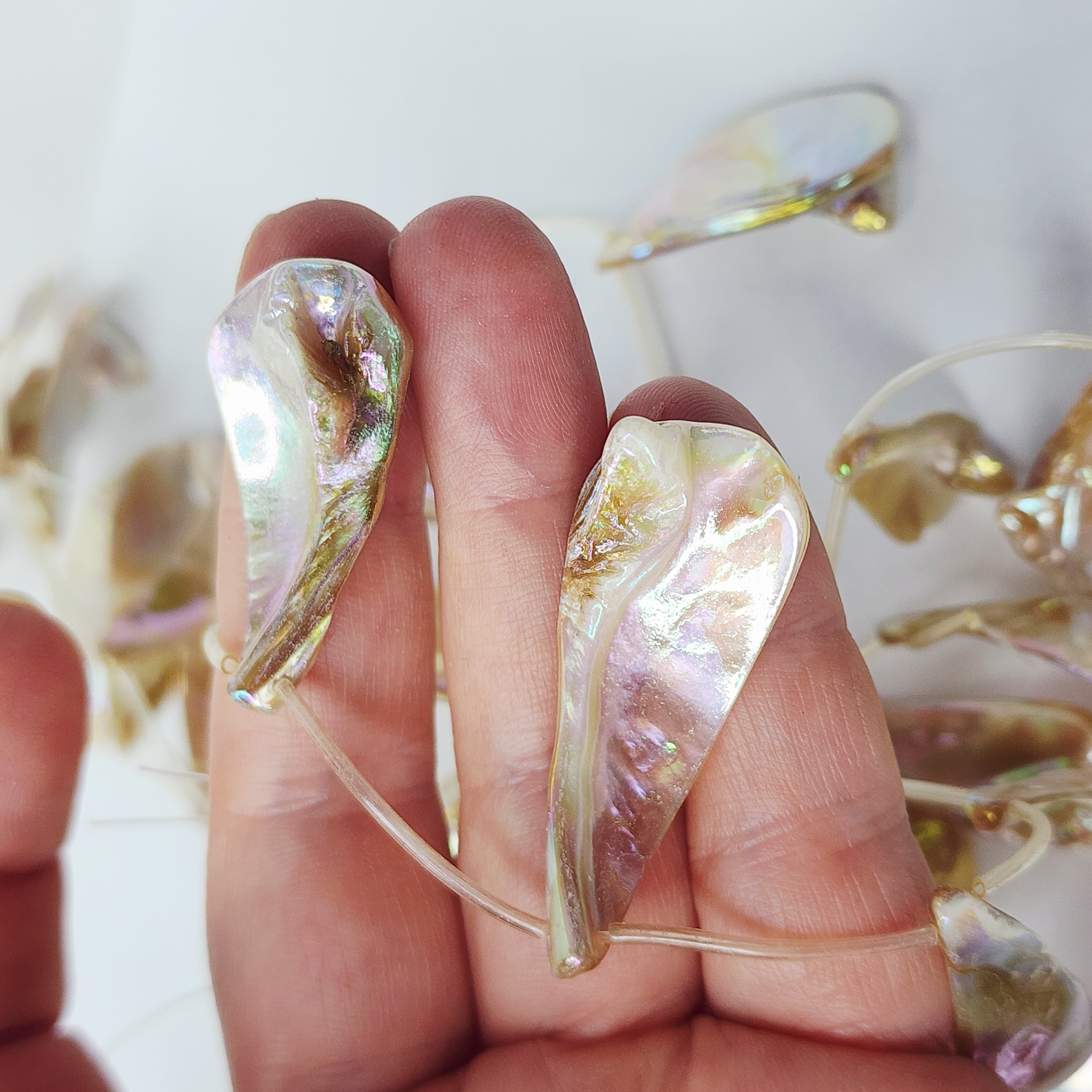 Подвеска с продольным отверстием, натуральная раковина с перламутром с гальваническим покрытием АВ, красиво переливается, т.к материал природный, то характерны неровности и наросты.