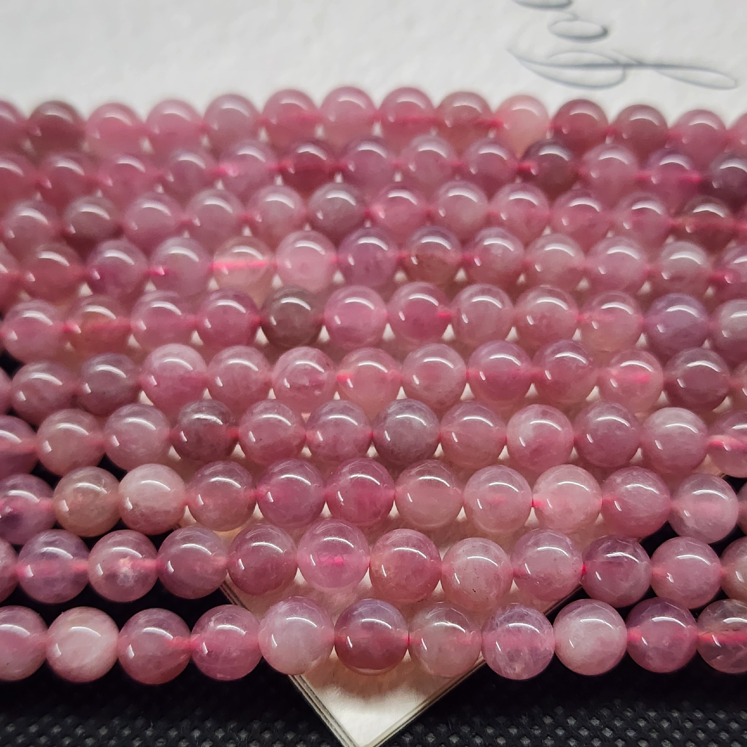 Оттенок варьируется от нежно-розового до более насыщенных тонов с лёгким сиреневым отливом. Такая окраска связана с нарушениями в кристаллической решётке, вызванными ионами титана и марганца. Минерал часто бывает полупрозрачным, с лёгкой «дымкой» или включениями, что добавляет ему глубины и загадочности.