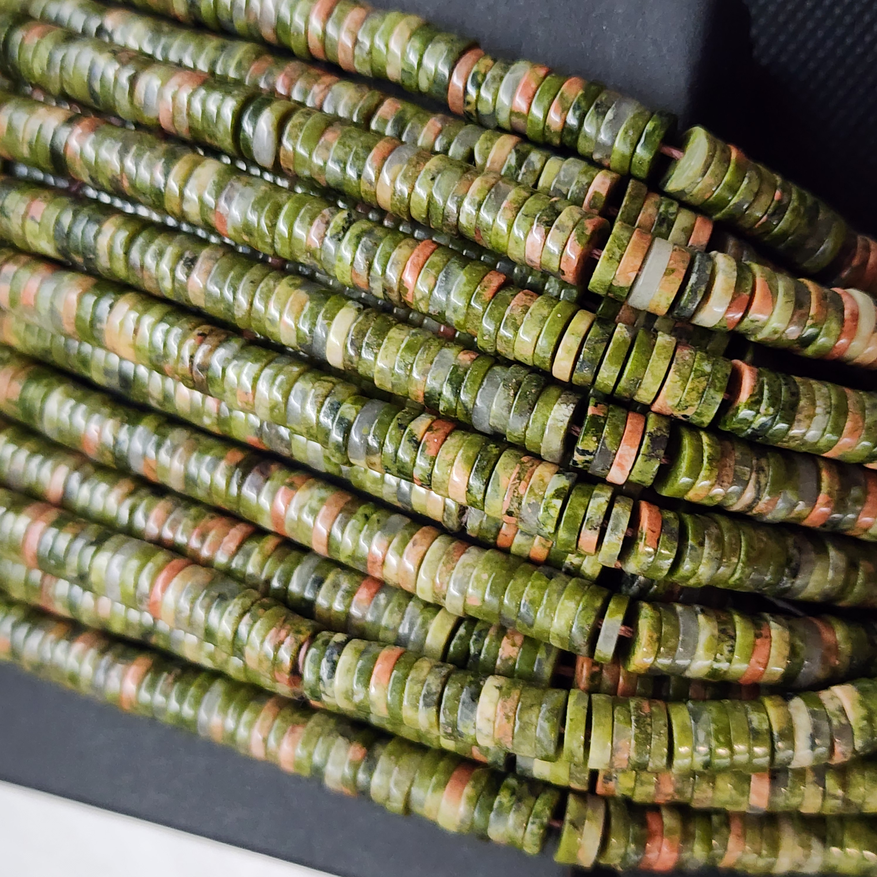Бусины природного унакита, форма дики, плоский рондель, полировка, средний размер 6.4 × 1.6мм, очень красивый яркий рисунок.